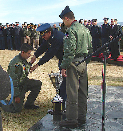 Todos los pilotos recibieron el tradicional brochazo con champagne, incluyendo este alumno proveniente de la Fuerza Aérea Boliviana. Entretenidos con la escena, en segundo plano se distinguen el Subsecretario de Asuntos Militares del Ministerio de Defensa, Germán Montenegro, el Jefe de Estado Mayor de la Fuerza Aérea, brigadier general Normando Constantino, el Jefe del Estado Mayor Conjunto, brigadier general Jorge A. Chevalier, y el Jefe de Estado Mayor de la Armada, Almirante Jorge O. Godoy.