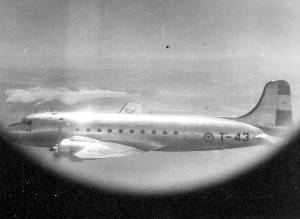 El T-43 fotografiado en vuelo desde otro DC-4, presumiblemente en el transcurso del V Viaje Final de Instrucción de la EAM (foto vía Santiago Rodoni, circa diciembre 1956).