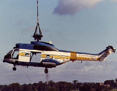 09 May 1982 Quedó fuera de servicio al ser alcanzado por esquirlas de fuego naval británico que dañaron el el sistema hidráulico del rotor de cola mientras se hallaba estacionado en el hangar Bear al Oeste de Puerto Argentino. Para preservarlo de mayores averías, se le quitaron las palas del rol principal, se lo trasladó a una plazoleta de Puerto Argentino y se lo enmascaró para protegerlo.