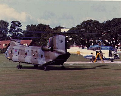 El PA-12 y el Chinook ZA709/BD del 18 Sqdn en RNAS Fleetlands, instantes después que el primero fuera depositado en la principal base aeronaval británica. En otra misión realizada el mismo día, el "Bravo Delta" trasladó al Chinook AE-520 del Ejército Argentino (Foto Clifford Burrell, 19 Ago 1982).