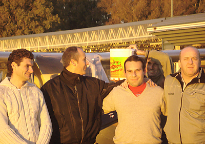 Hacía varios sábados que estábamos haciendo circuitos y más circuitos. Y, por una u otra razón, no conseguía que me salieran bien. Cuando lograba corregir un error, descuidaba algún detalle que me hacía incurrir en otro. Hasta que después de “pedalear” bastante en un día muy ventoso las cosas comenzaron a salir un poco mejor. Al sábado siguiente, cuando llegué al Aeroclub Escobar, mi instructor me recibió con un estridente “hoy es el gran día”, adelantándome que posiblemente saliera solo. Pero tras un vuelo corto, nos dimos cuenta que iba a ser imposible debido a que había demasiada niebla, lo que complicaba considerablemente la visibilidad. Una semana después, afortunadamente, la meteorología se presento casi perfecta ya que sólo corría una leve brisa... ¡ya no había excusas! Como de costumbre, tras la inspección exterior del LV-HBG, subimos a la cabina y concretamos los chequeos previos a posicionarnos en cabecera y salimos. Tras alcanzar los 700 pies de altura, comenzamos a realizar circuitos, los que practicamos por espacio de una hora aproximadamente. Tras terminar uno de ellos, el instructor me dijo “nos quedamos”; por lo que frenamos y comenzamos a desandar los metros de pista que habíamos dejado atrás en el aterrizaje. Mientras rodábamos por el campo, me preguntó: “¿Cómo te sentís para salir solo?”. A lo que respondí “bien”, “creo que bien”... ¡o algo parecido! Entonces frenamos. Y tras los últimos consejos, cerró la puerta y se fue caminando hacia el hangar. Volví a carretear para acercarme a cabecera, chequeé un par de veces que todo estuviera en orden y que no hubiera otro tránsito próximo al aterrizaje. Ocupé cabecera, di potencia al motor y despegué. Mucho más rápido de lo habitual llegué a los 300 pies, donde guardé flaps y saqué un poco de potencia. Al alcanzar los 500 pies, comencé a virar lentamente continuando el ascenso hasta los 700 pies. Ya paralelo a la pista y en inicial, puse aire caliente, reduje potencia para el vuelo lento y puse un punto de flaps. Siguiendo el consejo de mi instructor, prolongué un poco más de lo común mi inicial para tener una final más larga y por lo tanto entrar más “cómodo” a la pista. Al entrar en básica, reduje más la velocidad sacándole potencia al motor. Al meterme en final, traté de acomodar el avión dejándolo lo más centrado posible en el eje de la pista. No se si por el menor peso en la aeronave (o por mi imaginación), pero en ese momento me dio la impresión de que el avión se comportaba de una manera bastante distinta que la habitual. Corté motor y, cuando me acercaba a la cabecera, le di un “chorrito” de potencia que me permitiría llegar bien y tocar casi en los números. Ya con la pista asegurada, aire caliente adentro, hice el “flare” (que para mi sorpresa no fue brusco como esperaba) y frené utilizando gran parte de la pista. Desocupé corriéndome hacia uno de los extremos para dirigirme hasta el hangar y en el rodaje saqué el punto de flap que estaba puesto. Entré en plataforma y me estacioné frente al hangar. Detuve el motor, corté todo e hice las anotaciones pertinentes en el librito de abordo. Al bajarme, recibí las felicitaciones de mi instructor y gente que presenció mi vuelo. Aprovechamos para sacarnos una foto frente al avión, lo que sirvió para distraerme mientras preparaban el tradicional “bautismo”: Dos baldazos de agua mezclada con yerba mate, mostaza, aceite y otros “condimentos” de origen desconocido. Terminé empapado y hediendo. Pero eso ya era un detalle accesorio de poca importancia... ¡había terminado mi primer vuelo solo! |