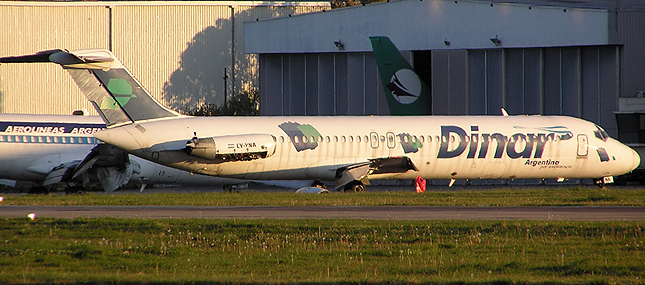 Después de brindar servicio durante años, como antes mencionamos, Dinar finalizó sus operaciones y consecuentemente los aviones de su flota que mantenían rentados retornaron a sus dueños. Los de la compañía quedaron, con la apertura del concurso preventivo, diseminados en diferentes aeródromos de nuestro país. Así nos encontramos, por ejemplo, el caso del matriculado N927L (MSN 48123), que en el año 2006 aún se lo podía ver preservado en Tucson, Arizona (EE.UU.) vistiendo los colores de Dinar. O, particularmente el caso de los aviones que permanecieron en Argentina, como los matriculados LV-YPA y LV-YOA que fueron preservados en el aeródromo El Palomar sin sus motores. Y el caso que nos convoca, el matriculado LV-YNA, que años después de la desaparición de su operador, permanecía en política de preservación en la posición 41 de la plataforma industrial del Aeroparque Metropolitano Jorge Newbery de la ciudad de Buenos Aires, todos a la espera de mejor suerte.