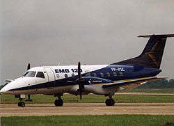 El EMB-120 Brasilia PP-PSC, uno de los aviones que Embraer utiliza para trasladar a sus ejecutivos, fotografiado en BACO durante el VIP Day (foto G. Sentis).
