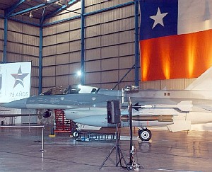 La vedette de la muestra, por lo menos desde el punto de vista militar local, serán los F-16C/D Fighting Falcon, cuyos dos primeros ejemplares fueron presentados al Presidente Ricardo Lagos el 31 de enero (foto FACH).