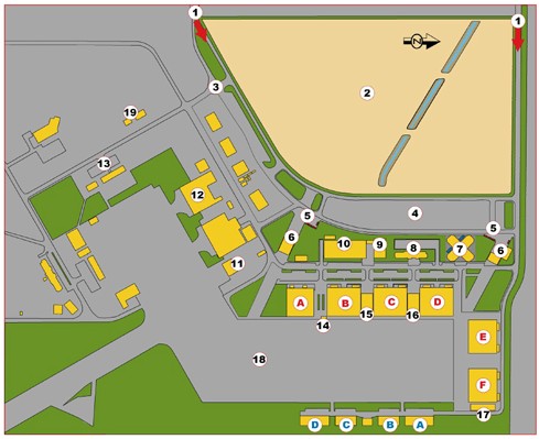 La muestra se alojará en instalaciones del Grupo de Aviación No.10 de la Fuerza Aérea de Chile, las que se encuentran en el extremo Norte del aeropuerto Santiago/"Arturo Merino Benítez". Para dar cabida a la muestra, la FACH ha realizado obras civiles que permitirán a FIDAE explotar 91.000 metros cuadrados al aire libre, 21.000 metros cuadrados bajo techo, 9 pabellones, 28 chalets y un gran estacionamiento específico. La disposición del área de exposición estática y chalets revela que las exhibiciones aéreas tendrán lugar sobre el eje de pista 17L, lo que asegura las mejores condiciones de luz para fotógrafos durante la tarde. Referencias del plano: 1 Acceso, 2 estacionamiento público, 3 estacionamiento empresas de servicios, 4 estacionamiento expositores, 5 boleterías, 6 acreditaciones, 7 club del expositor, 8 dirección ejecutiva, 9 centro de servicios al expositor, 10 centro de convenciones, 11 pabellón espacial, 12 restaurante, 13 operaciones aéreas, 14 centro de observación, 15 salón del expositor, 16 centro de prensa, 17 catering,  18 parque de aeronaves y  19 enfermería. En color rojo se destacan los pabellones cubiertos y en celeste los chalets empresarios (Fuente: FIDAE).