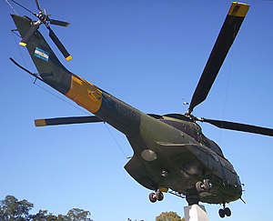 Vista 3/4 posterior e inferior del AE-506 tal como se lo puede apreciar en el monumento a la Aviación de Ejército de la localidad bonaerense de Malvinas Argentinas (foto Esteban G. Brea, junio de 2005).