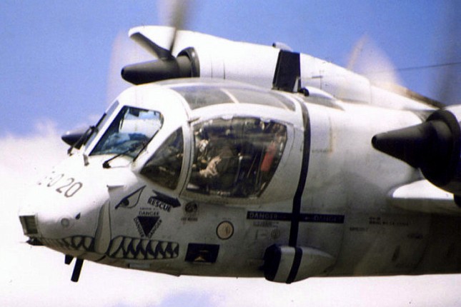 Detalle de la trompa del AE-020 con la boca de jabalí. A diferencia de los otros shark mouths aplicados previamente en los OV-1D, este diseño fue completado en tonos de gris para respetar el esquema de baja visibilidad (foto: Javier Mosquera y Guillermo Gebel).