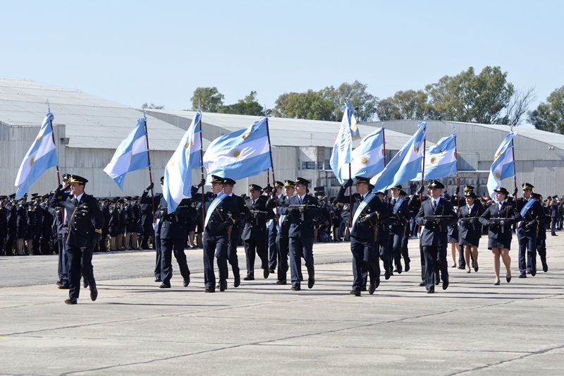 Ahora bien, aunque la estructura, la doctrina y el equipamiento sean muy importantes, la capacidad de la Fuerza Aérea Argentina seguirá descansando sobre su personal, por ello vaya mi reconocimiento a quienes se encuentran ahora mismo cumpliendo cotidianamente su tarea de manera silenciosa frente a una pantalla de radar, en la cabina o en la primera línea con sus aeronaves, apostados de guardia en cada una de nuestras unidades o sosteniendo la actividad antártica y representando a nuestro país en el exterior, los adelantos y las nuevas tecnologías de desarrollo vertiginoso donde la realidad parece superar a la ciencia ficción deben impulsarnos a apostar por el conocimiento y la capacidad de innovación pero sin olvidar que en la calidad de sus personas y en la educación y no solo la de las máquinas es la que hace posible un futuro mejor, por ello la complejidad del liderazgo de nuestra Fuerza Aérea hoy en mantener la motivación, fomentar el trabajo en equipo y retener el talento del personal que ha sentido el llamado de la vocación de servicio vistiendo nuestro uniforme azul, celeste que nos identifica, la manera de estar a la altura de esos desafíos planteados por este siglo es comprender lo fundamental de la superioridad del conocimiento pero siempre sostenida por lo que seguirá siendo una marca de nuestra Fuerza, el coraje, la vocación de servicio, el honor y la voluntad de vencer sin rendirse pese a las dificultades. Sirvan estas palabras para alentar la vocación de servicio de los hombres y mujeres que forman parte de la institución y que buscan una señal de optimismo que indiquen que las alas de la patria están asumiendo una actitud de variómetro en ascenso. Frente a este futuro promisorio las nuevas generaciones que revisten en la institución deben continuar con el ejemplo de quienes hicieron posible este progreso que en cada época entregaron su aporte personal y a veces sus vidas en aras del cumplimiento del deber y para hacer más grande a su patria y nuestro anhelo debe ser que los responsables de conducir nuestros destinos sigamos admirando la formidable herramienta disuasiva y por ende de paz que representa para un país con el contexto geopolítico del nuestro disponer de una Fuerza Aérea equipada con tecnología de punta y tripulada con hombres y mujeres bien adiestrados.