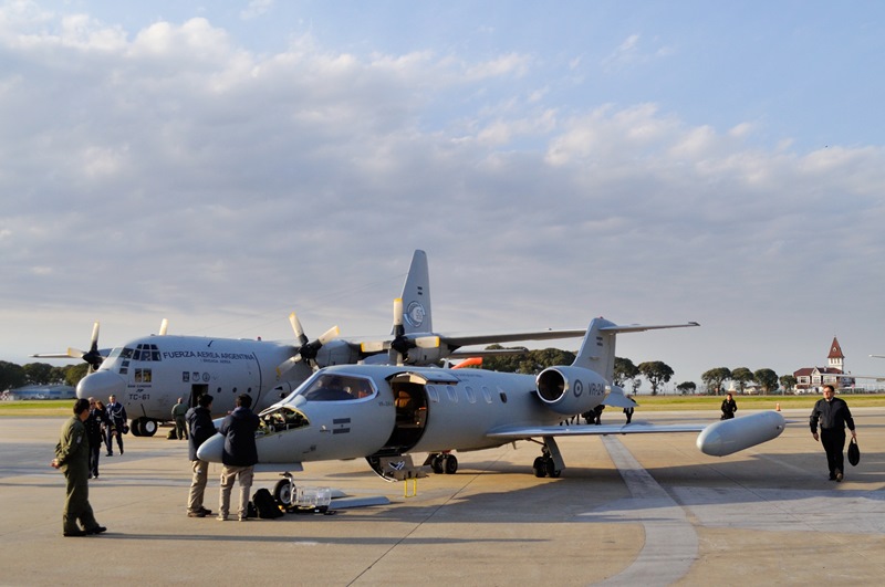 El Learjet 35 VR-24 recibe una revisión técnica por parte de personal de Redimec tras su arribo al Aeroparque Jorje Newbery, en segundo plano el C-130H Hercules TC-61, ambas aeronaves estuvieron afectadas al traslado de autoridades e invitados desde Buenos Aires. (Foto: Andrés Rangugni)