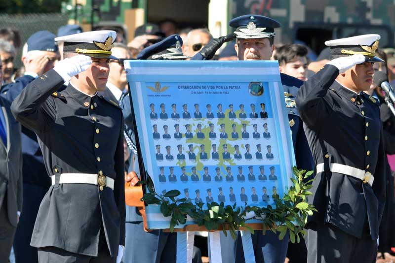En nombre de la institución, rindo el merecido homenaje a los combatientes, militares y civiles, que fueron y lucharon, a los que apoyaron desde el continente y desde las bases de despliegue y por sobre todo, a los 55 héroes que quedaron en las islas y a sus familiares.