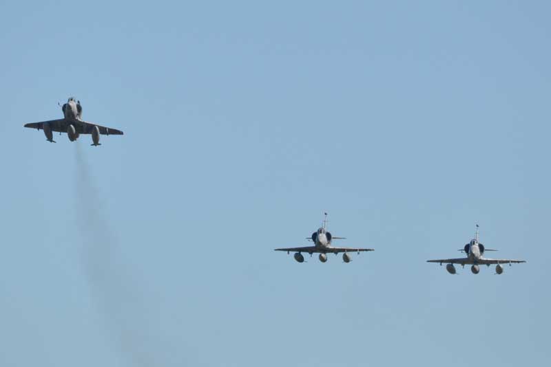 Esto dio paso a una invocación religiosa a cargo del Capellán Mayor de la FAA, Presbítero Ricardo González, y seguidamente, el Brigadier VGM Eduardo Daghero, Oficial de la FAA más moderno que participó en el Conflicto de Malvinas, leyó la nómina del personal caído en combate, dando paso a un toque de silencio coronado por el pasaje de una escuadrilla compuesta por tres A-4AR Fightinghawk con el desprendimiento de uno de ellos en ascenso, simbolizando al numeral caído.