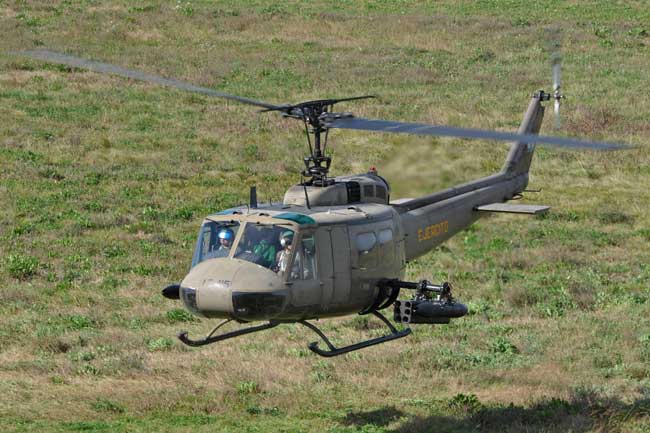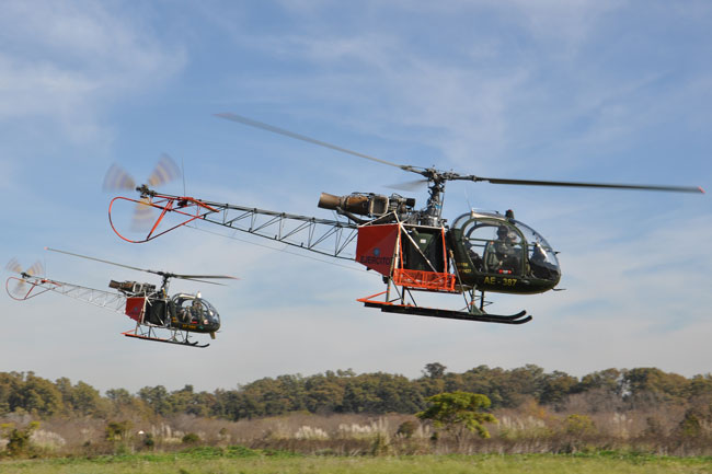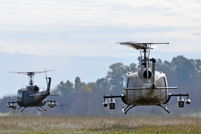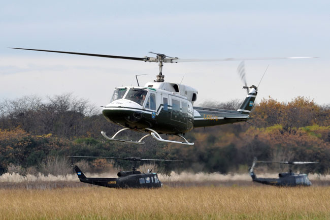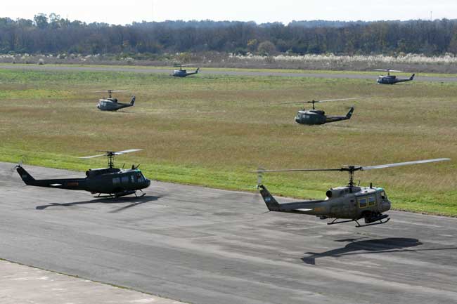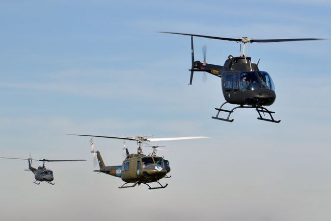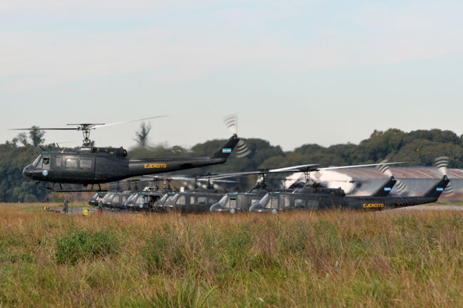 Afortunadamente la jornada del miércoles 29 amaneció con una meteorología bastante más favorable permitiendo la normal realización del desfile, esto se inició con la puesta en marcha de todo el componente de alas rotativas a las 11:00 horas. Lentamente, las máquinas se fueron posando sobre el paño verde lateral a la pista, en dos columnas paralelas. Encabezando la misma, se encontraba el AS-332L Super Puma AE-526, que fue seguido por dos SA-315B Lama pertenecientes a la Sección de Aviación de Ejército de Montaña 8, tras estos, se encontraban los UH-1H-BF Iroquois, los UH-1H-II Huey II y el Bell 212 Twin Two Twelve AE-450 del Batallón de Helicópteros de Asalto 601. Finalmente se encontraban cerrando la formación, dos UH-1H-BF pertenecientes al Escuadrón de Exploración y Ataque 602 artillados con dos pods SF-260W de Cal 7,62 mm y dos coheteras Microbio de 105 mm.