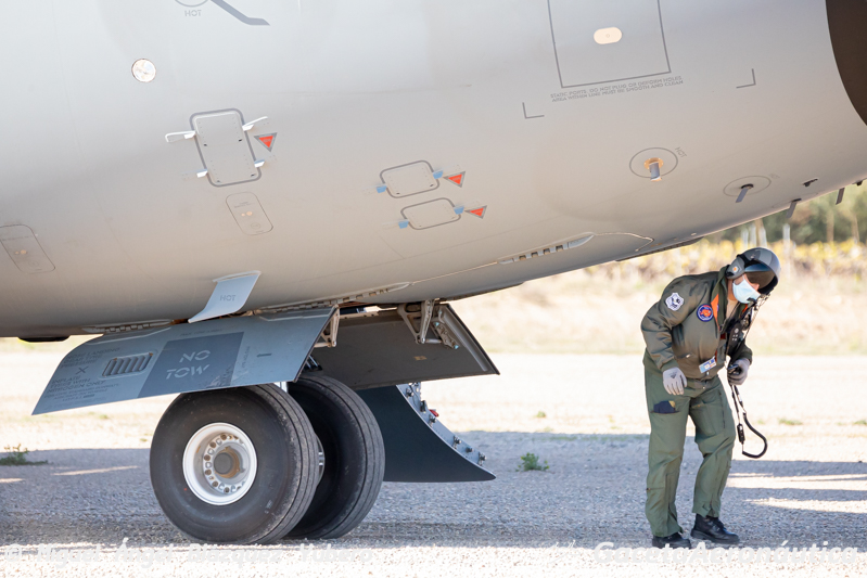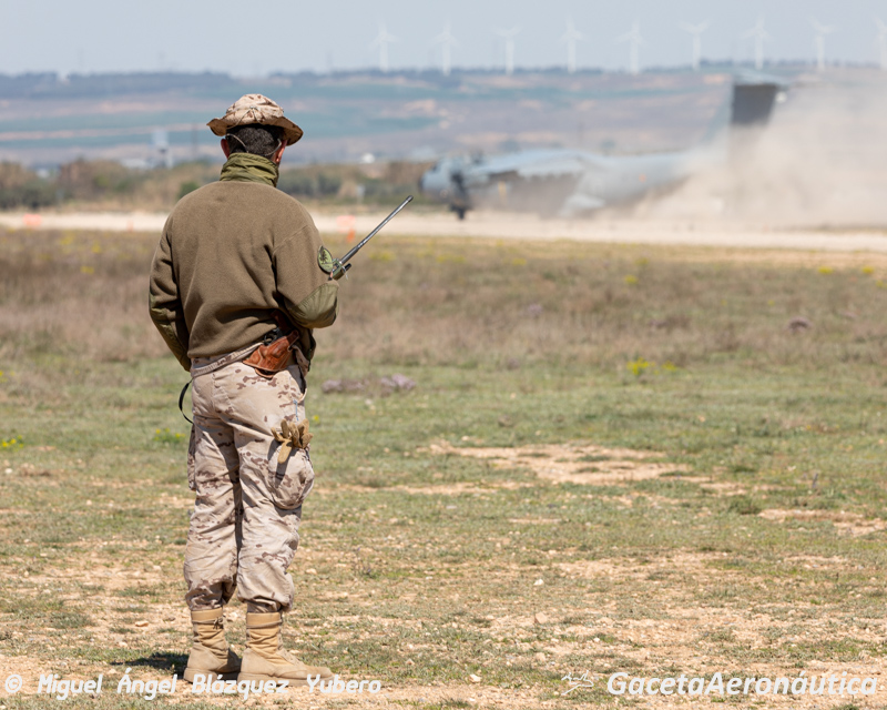 Durante la jornada de hoy la planificación incluía la realización de tomas de máximo esfuerzo y el lanzamiento de paracaidistas en apertura manual, sin embargo el viento racheado ha obligado a cancelar los saltos paracaidistas de personal del EADA. El avión se alinea de nuevo con rumbo de pista, baja tren y realiza una nueva toma, repitiendo la misma secuencia descrita anteriormente, entrenamiento y procedimentación son esenciales en este tipo de operaciones.