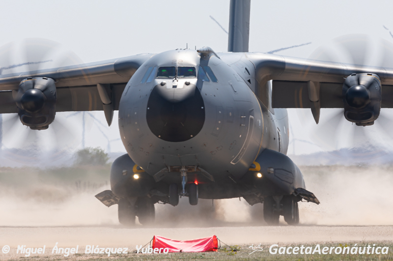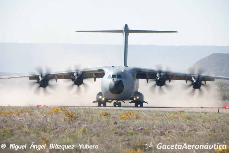Mamut 01 es el primero de los A400 que hoy tiene asignado un periodo de operaciones en el aeródromo. A las 1015 hora local ha contactado con el equipo de CCTs que le han informado sobre la pista en servicio y la meteo, hoy es un día con fuerte Cierzo y la pericia de los pilotos se pone a pruebas en las tomas con rachas de viento cruzado. La primera toma se ha realizado dentro de la caja señalizada por los CCTs y el avión ha recorrido con normalidad la pista de tierra hasta que ha frenado. Haciendo un backtrack ha retornado de nuevo a la cabecera de la pista en servicio y allí, levantando una enorme polvareda, ha puesto las hélices en bandera para que el supervisor de carga del avión pueda bajar a tierra y hacer una inspección visual de la aeronave.