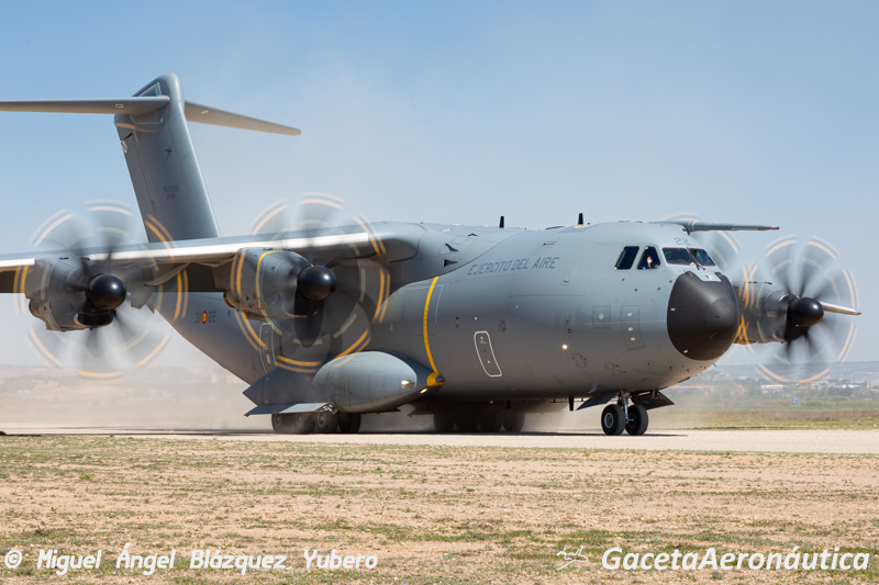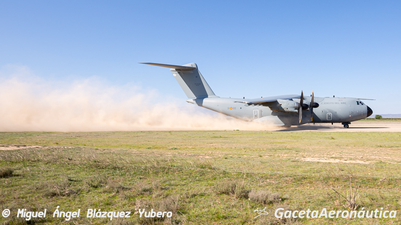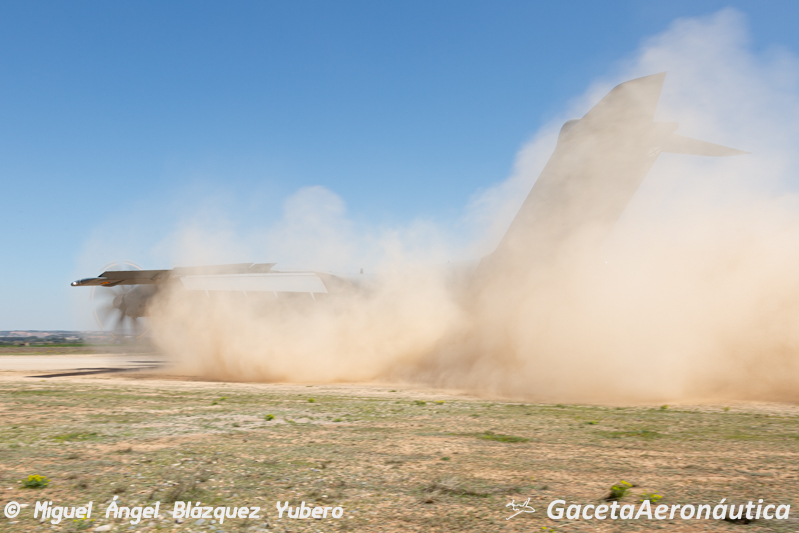 Podríamos estar en una pista sin preparar en África o Afganistán, sin embargo en esta ocasión Mamut 01 acaba de tomar tierra en el aeródromo de Ablitas, escenario habitual de los PLIC (Plan de Lanzamientos de Instrucción y Cargas) del Ejército del Aire. Durante la semana del 12 al 16 de Abril el Ejército del Aire ha desplazado efectivos y aeronaves de las Ala 35 y 37 a la Base de Zaragoza para, en coordinación con el Ala 31 y el Escuadrón de Apoyo al Despliegue Aéreo, llevar a cabo este ejercicio en el que periódicamente el Ejército del Aire entrena las operaciones tácticas en campos de aterrizaje sin preparar.