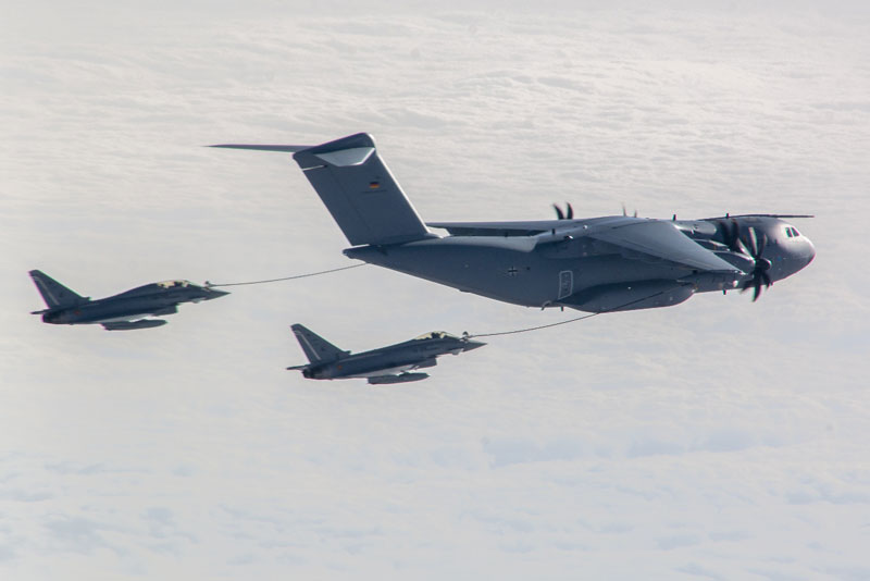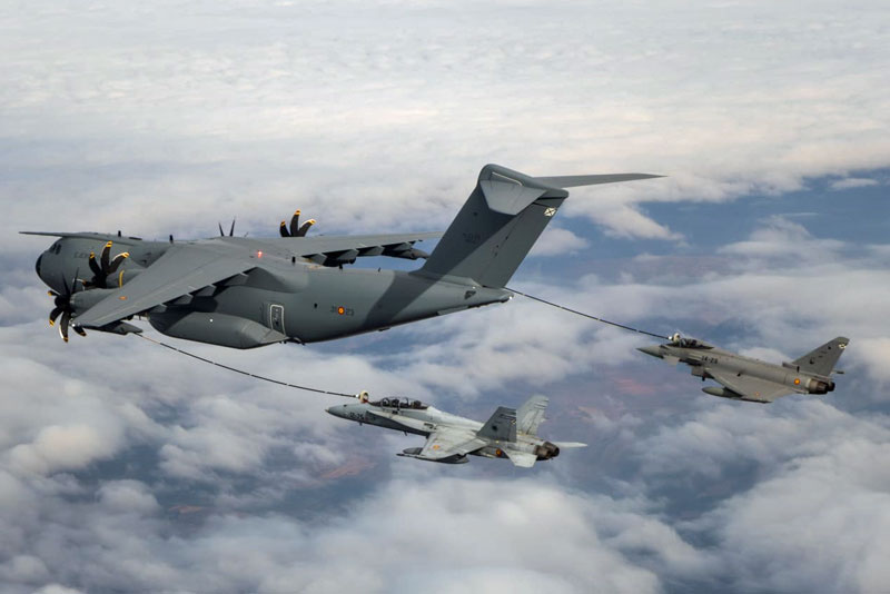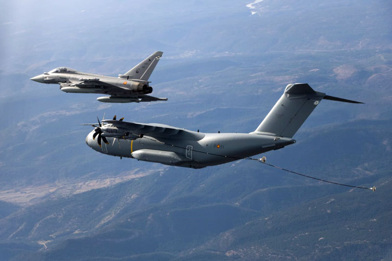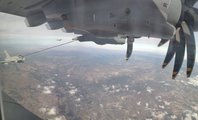 En estas semanas se está realizando el programa de pruebas para certificar las operaciones de reabastecimiento en vuelo (AAR) del Eurofighter. No olvidemos que el F-18 Hornet ya está habilitado para ello, habiéndose realizado dicha certificación por parte de Airbus con aviones F-18 del Ejercito del Aire asignados al CLAEX. Queda patente de esta manera el enorme peso específico que está llevando España en todo lo referente a las capacidades de AAR del A400M, siendo en esta ocasión el Ejercito del Aire el que lidera de forma totalmente autónoma esta campaña. En esta línea es de destacar que la Luftwaffe ha desplegado uno de sus A400M a Zaragoza para participar en el proceso y así poder aprovechar los vuelos de los Eurofighter españoles, al objeto de certificar su flota. La Luftwaffe había realizado ya la certificación de sus Tornados pero aún tenía pendiente las pruebas con Eurofighter, únicamente había realizado algunos ensayos en tierra.