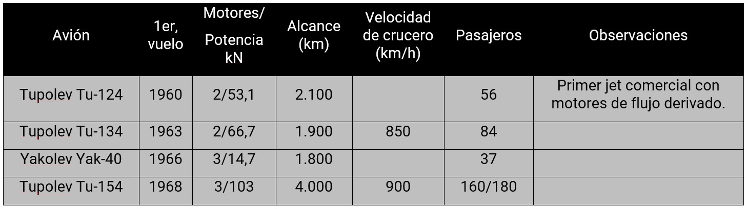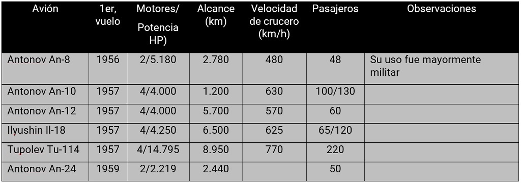 Después de esta primera aproximación al tema, los aviones comerciales soviéticos de postguerra fueron fundamentalmente turbohélices, de mediano alcance, lo necesario para cubrir las distancias de su red. Un detalle simplificado de esas aeronaves es el siguiente: