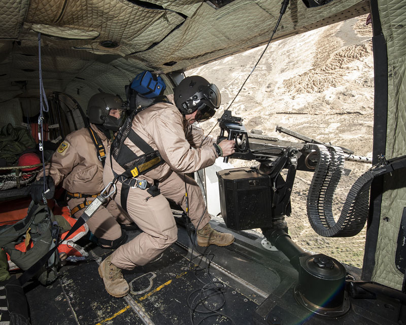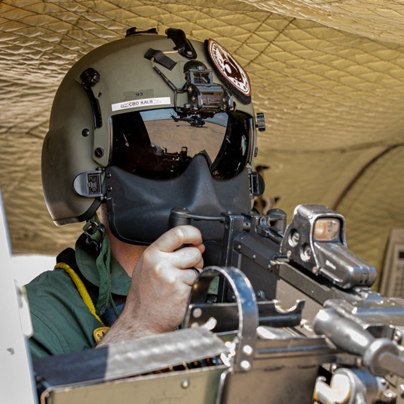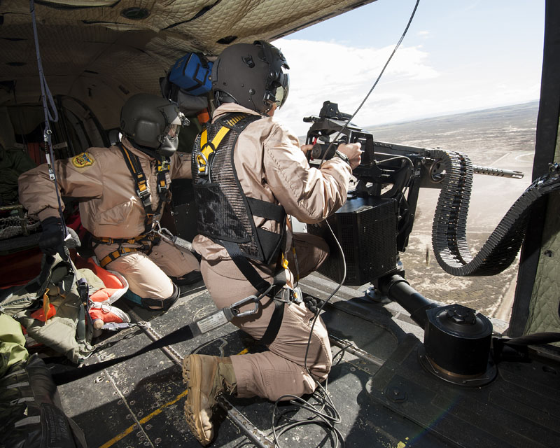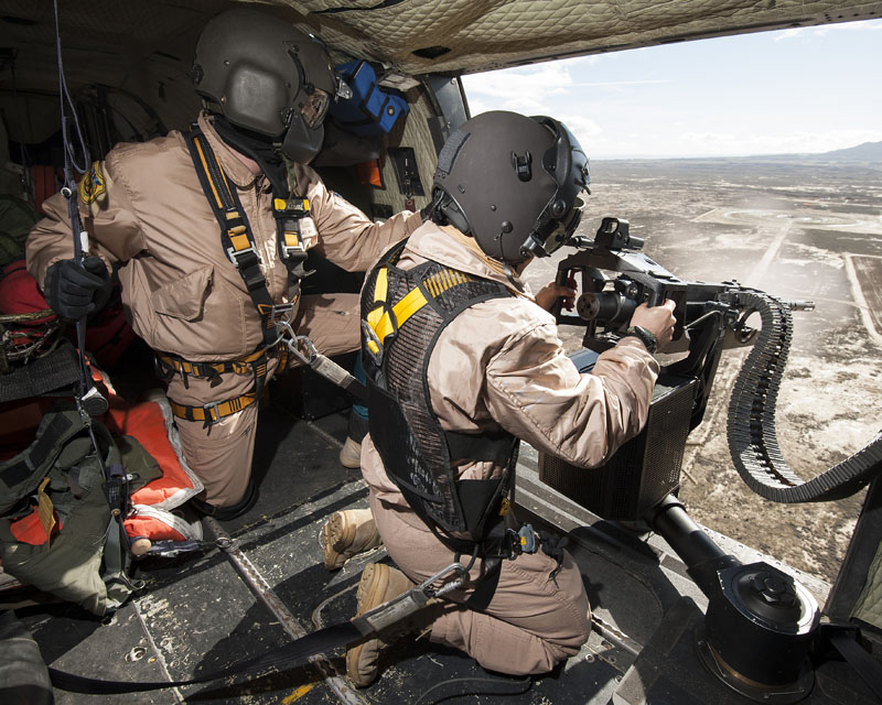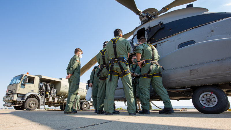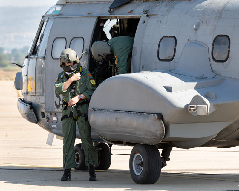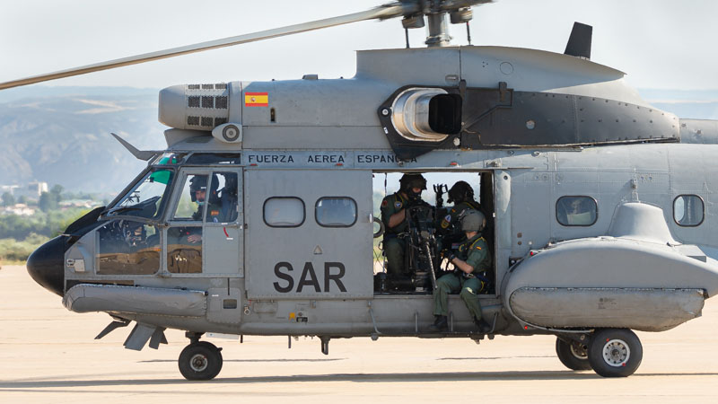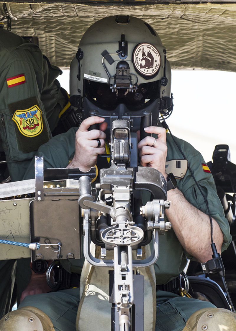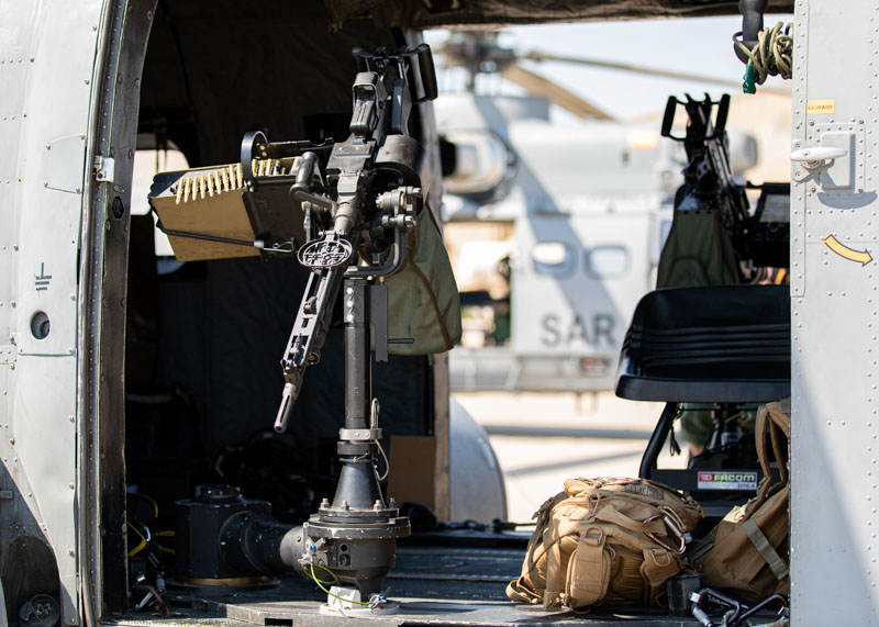 Dentro de las misiones que tiene asignada el Ala 48, en esta jornada el protagonista es el 803 Escuadrón, sus tripulaciones van a entrenar el tiro aire-superficie, capacidad normalmente aplicable en misiones con perfil PR (Personnel Recovery), CSAR (Combat SAR) y CR (Combat Recovery). No es habitual ver los helicópteros del Ala 48 armados con sus M3M de 12,70 mm y las ametralladoras ligeras de 7,62 mm, dos elementos imprescindibles en este tipo de tareas. Las tripulaciones rearman los dos helicópteros y ultiman los preparativos para el siguiente periodo programado en Bardenas. El perfil de la misión es Low-Low-Low, con ruta de baja cota para entrar en Bardenas, ataque a los blancos a baja cota y recuperación en las base de Zaragoza a baja cota.