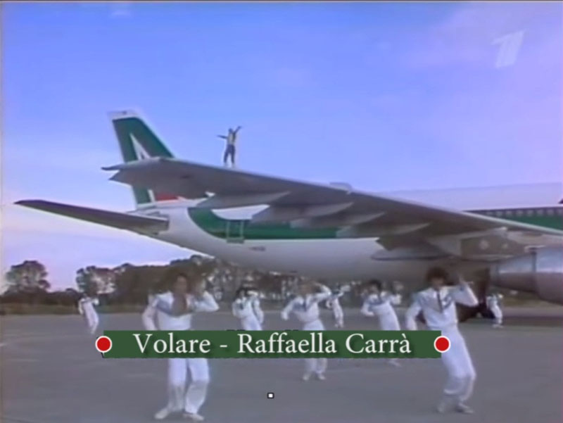 En ese momento se produjo este extraño video, cuya primera parte, que ocupa más de la mitad del film y tiene como música, exclusivamente, la versión original de Modugno, es una identificación de la Alitalia tradicional con la italianidad, con imágenes de paisajes, fútbol, el mapa satelital y, fundamentalmente, los aviones de Alitalia.