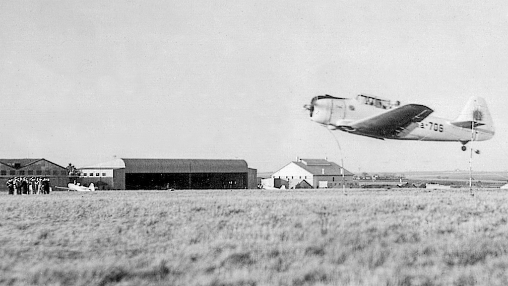 La paz se ve interrumpida por el ronquido de un Junkers Ju-52 trimotor que aterriza en el campo de la base.