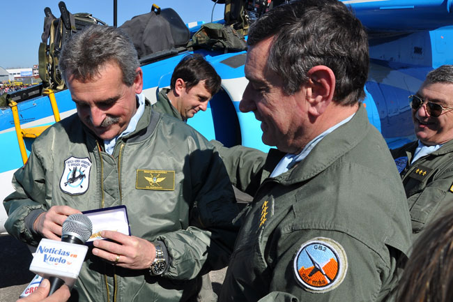 Tras sobrevolar la muestra, las aeronaves aterrizaron y se dirigieron a plataforma donde el Brigadier Mayor Callejo hizo entrega del Brevet de Aviador Militar Honorífico y del pañuelo correspondiente al citado sistema de armas al Ministro Rossi.