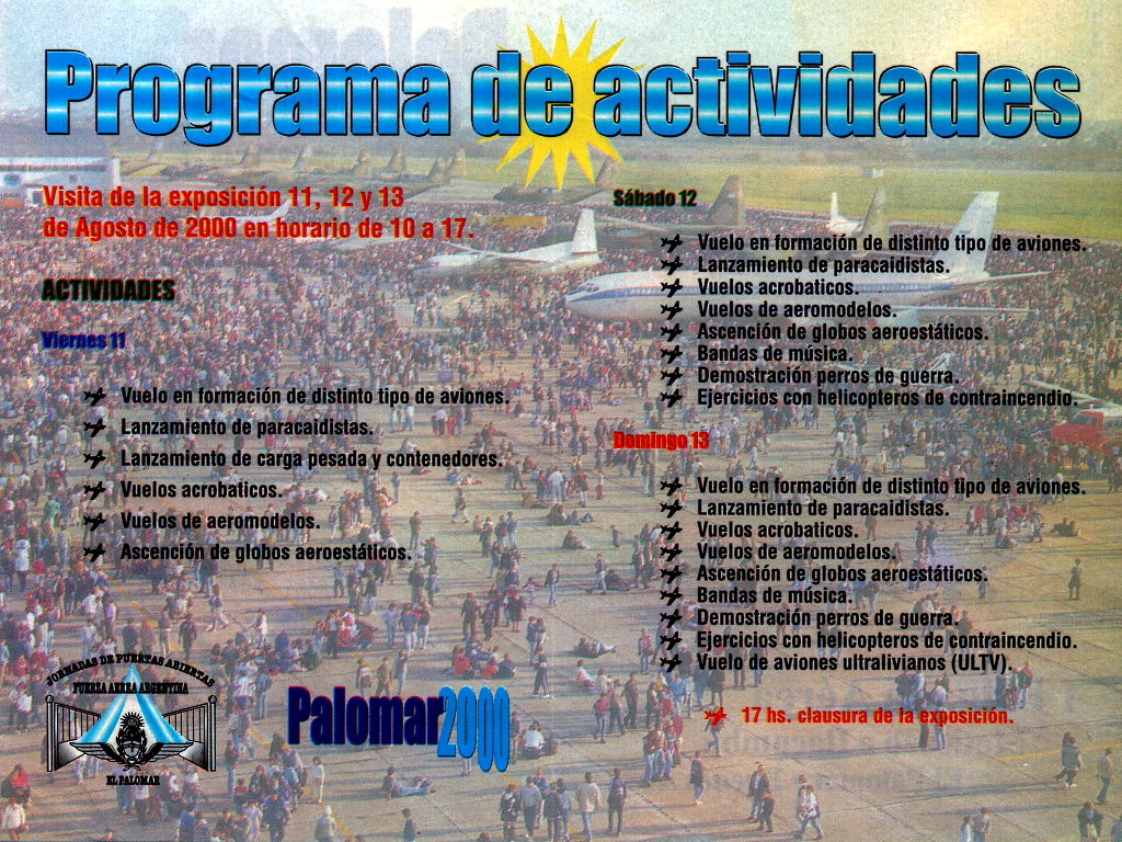 Puertas abiertas: 03-04/05 (INAC). Día Aeronáutica del Niño: 08/08 (Buenos Aires). |