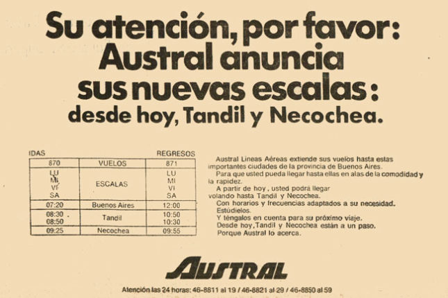El 4 de enero de 1978 La Prensa de Buenos Aires publicó este aviso de Austral en el que se anunciaban nuevos destinos. Tres días después hubo otro anuncio similar.