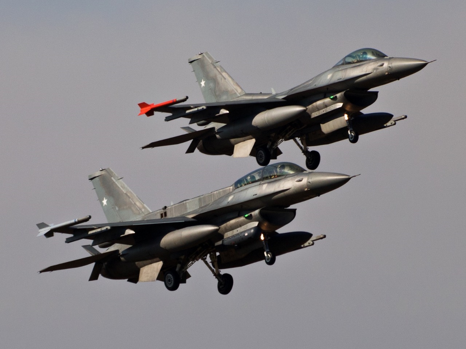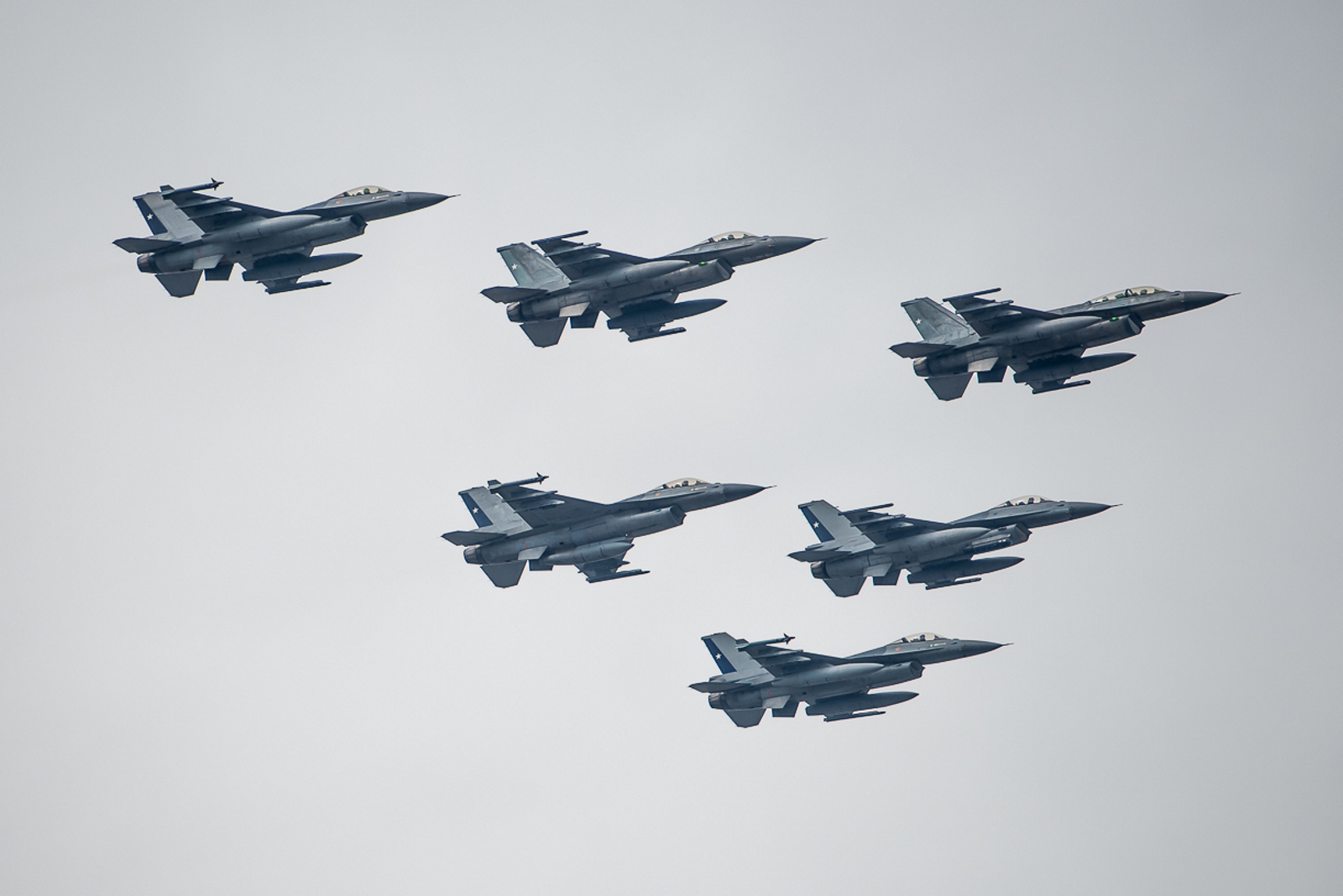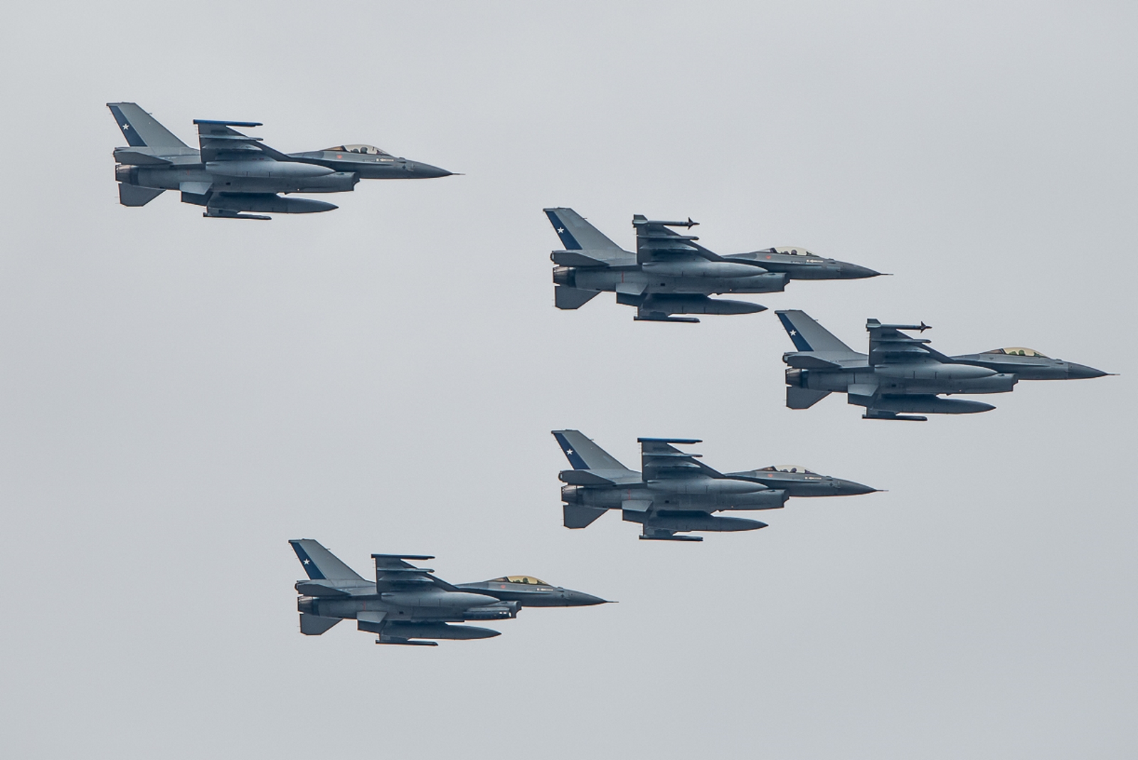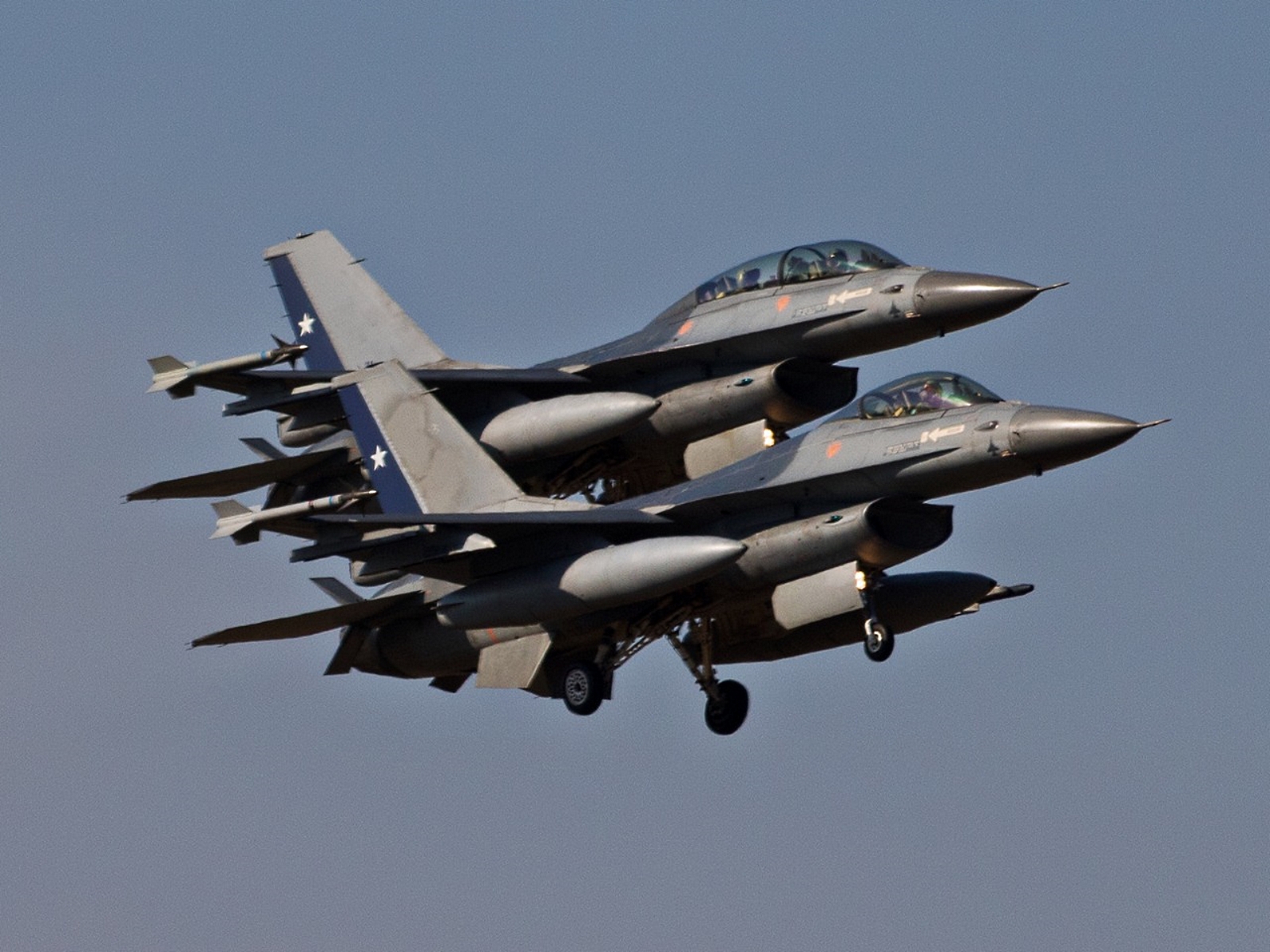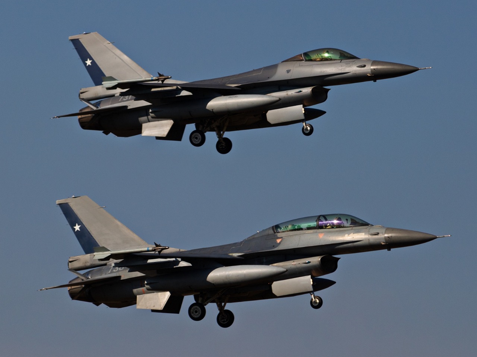Formación mixta de F-16A/B «MLU» de la V Brigada Aérea y F-16C/D «Block 50» de la I Brigada Aérea (foto: Cristian Castro Marín).
