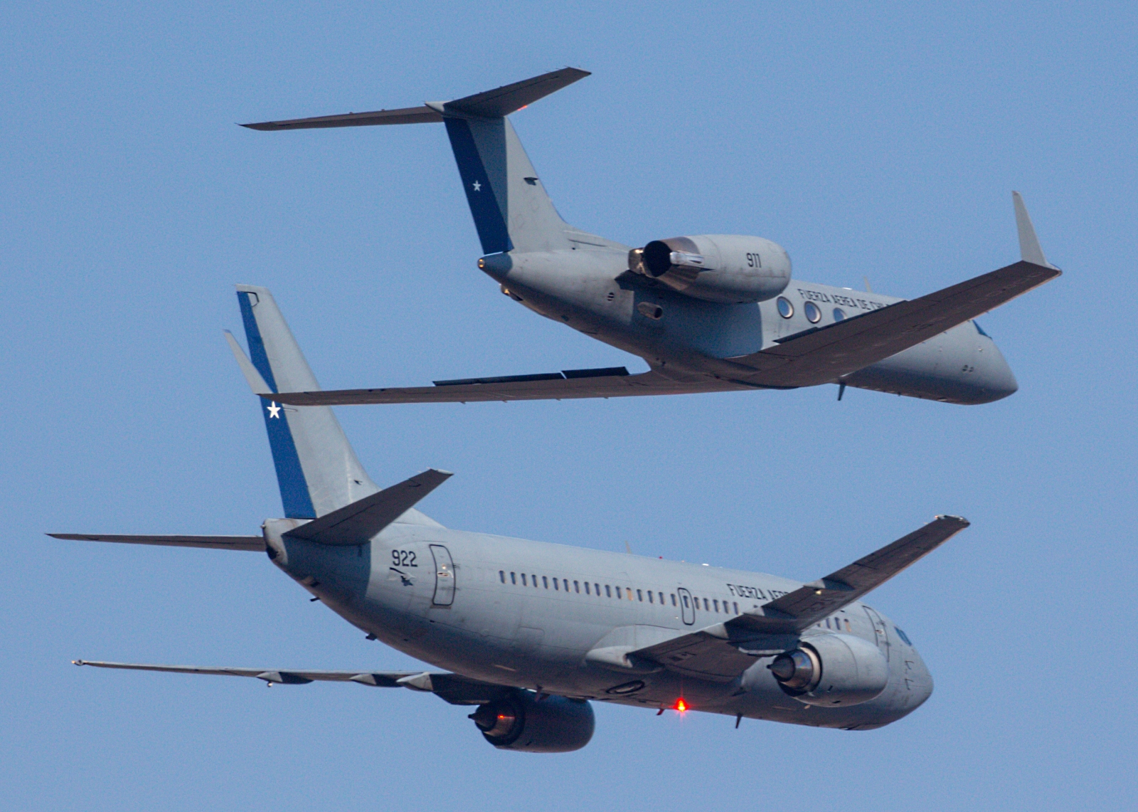 Dos jets de la principal unidad de transporte aéreo de la FACH sobrevuelan el Parque O’Higgins durante la revista preparatoria del jueves 13: El Boeing 737 922 y el Gulfstream IV 911 (foto: Carlos Ay).