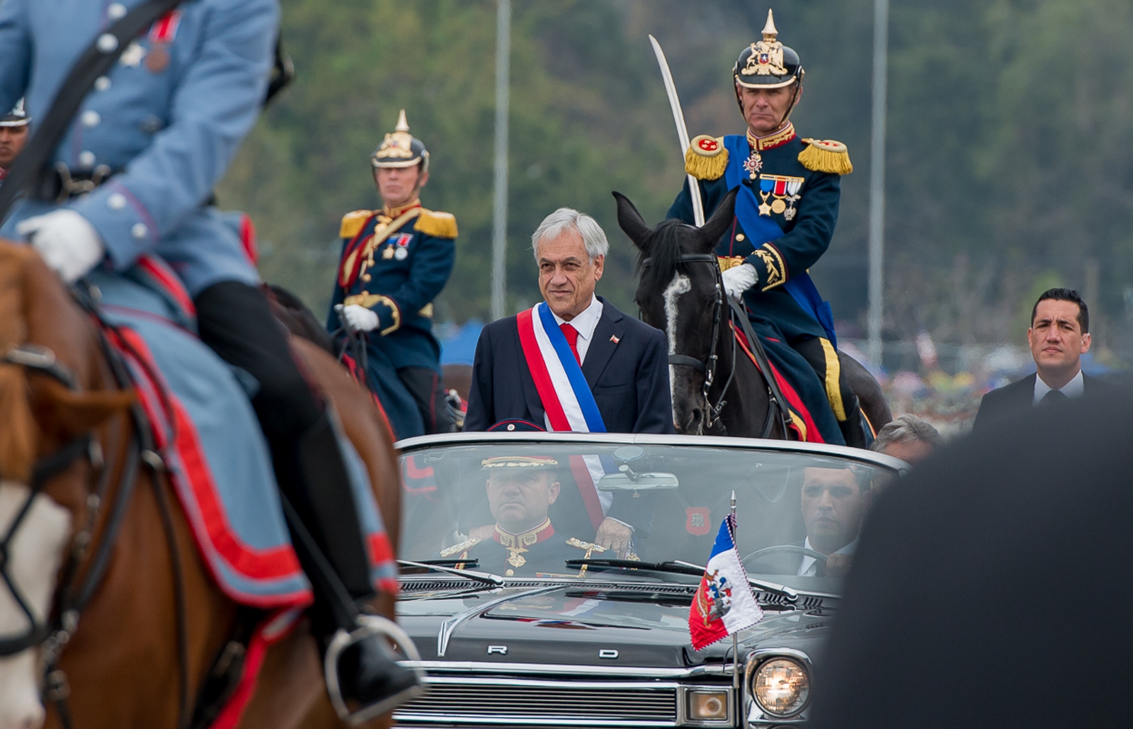 Escoltado por el Comandante General de la Guarnición Militar de la Región Metropolitana y Jefe de las Fuerzas de Presentación, general de división Eduardo González Fuentealba, el Presidente Sebastián Piñera Echenique se aproxima a la tribuna oficial tras revisar las tropas de las escuelas matrices de las fuerzas armadas y de seguridad (foto: Cristian Castro Marín).