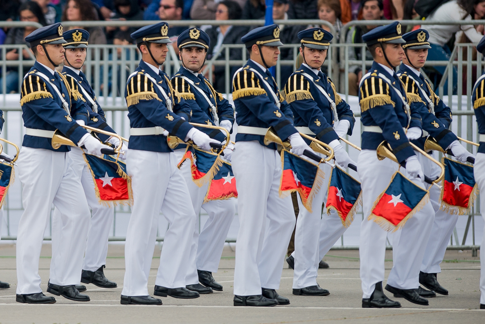 Integrantes de la banda militar de la Escuela de Aviación «Capitán Manuel Ávalos Prado» toman posición frenta al palco oficial anticipando el desfile de cadetes de esa institución (foto: Cristian Castro Marín).