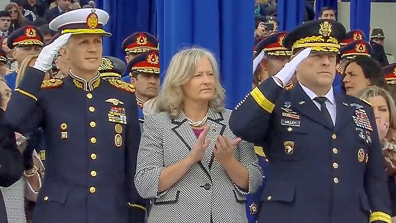 Los jefes de estado mayor de los ejércitos de Argentina, general de brigada Claudio Ernesto Pasqualini, y los Estado Unidos, general Mark Milley, saludando al paso de las banderas de Argentina, del Ejército de los Andes y los regimientos argentinos de Patricios y Granaderos a Caballo (captura video: Televisión Nacional de Chile/TVN).