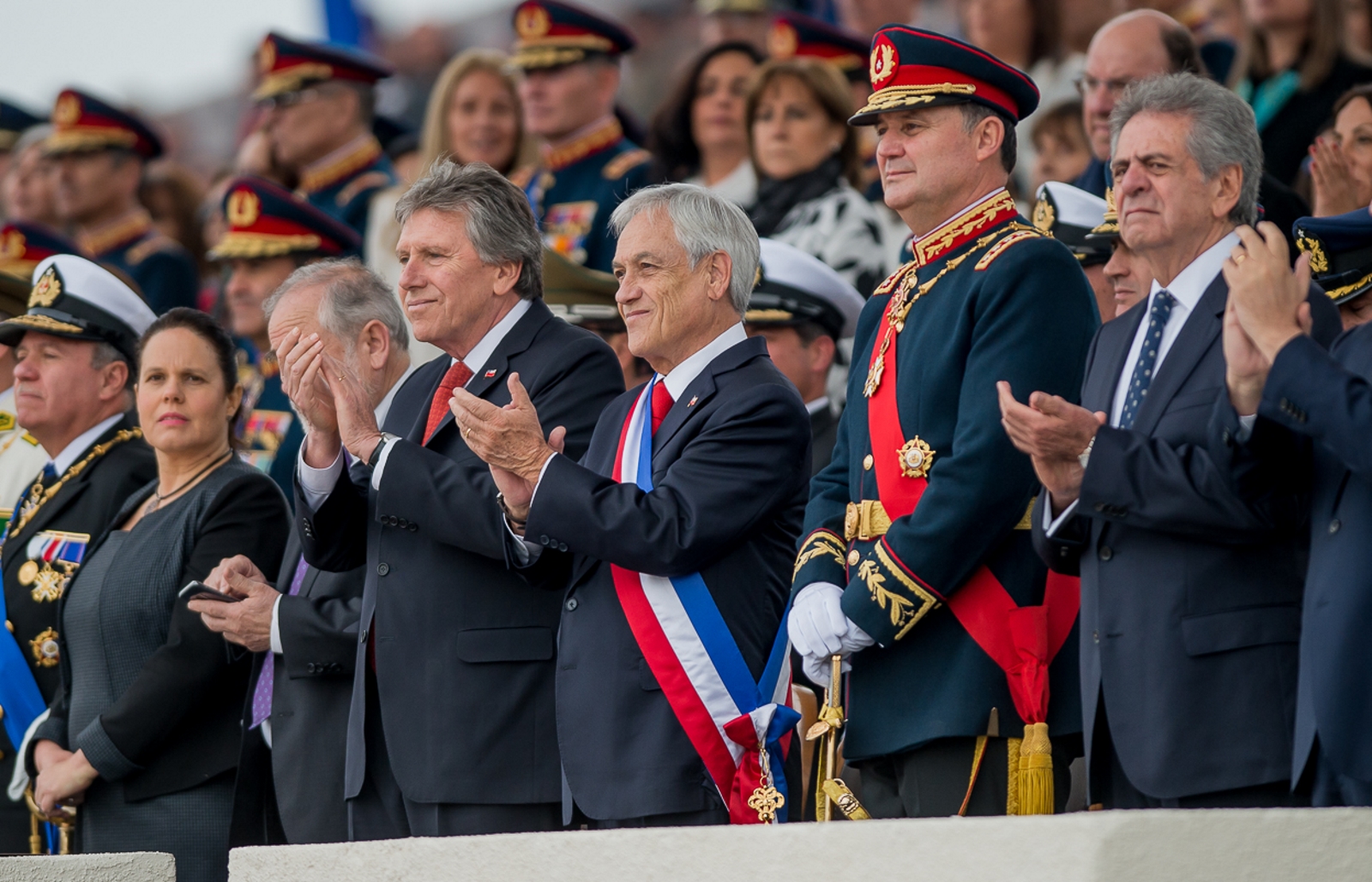 Primera fila en la tribuna de honor. De izquierda a derecha, se aprecian el Comandante en Jefe de la Armada, almirante Julio Leiva Molina, la Presidente de la Cámara de Diputados, Maya Alejandra Fernández Allende, el Presidente del Senado, Carlos Montes Cisternas, el ministro de defensa nacional, Alberto Espina Otero, el presidente de la nación, Sebastián Piñera Echenique, el Comandante en Jefe del Ejército, general Ricardo Martínez Menanteau, y el presidente de la Corte Suprema, Haroldo Brito Cruz (foto: Cristian Castro Marín).