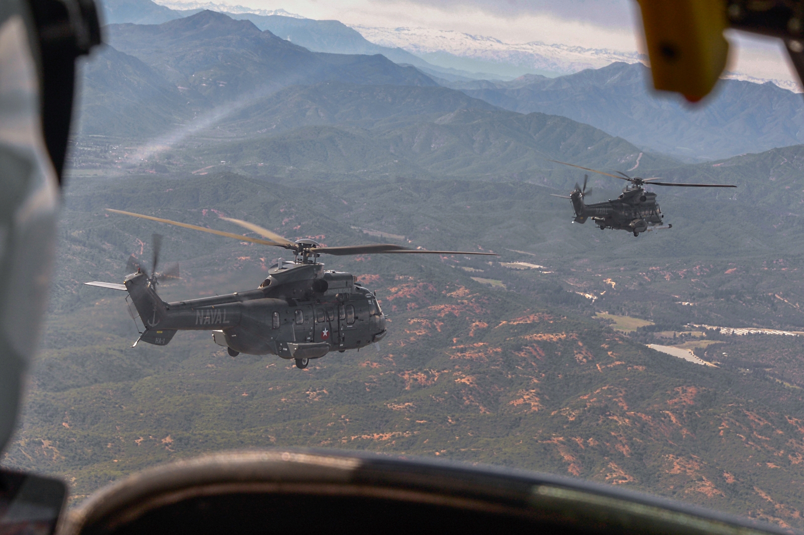Un AS332 Super Puma y un AS532 Cougar aeronavales sobrevuelan valles de la precordillera de la costa camino a Santiago (foto: Armada de Chile).