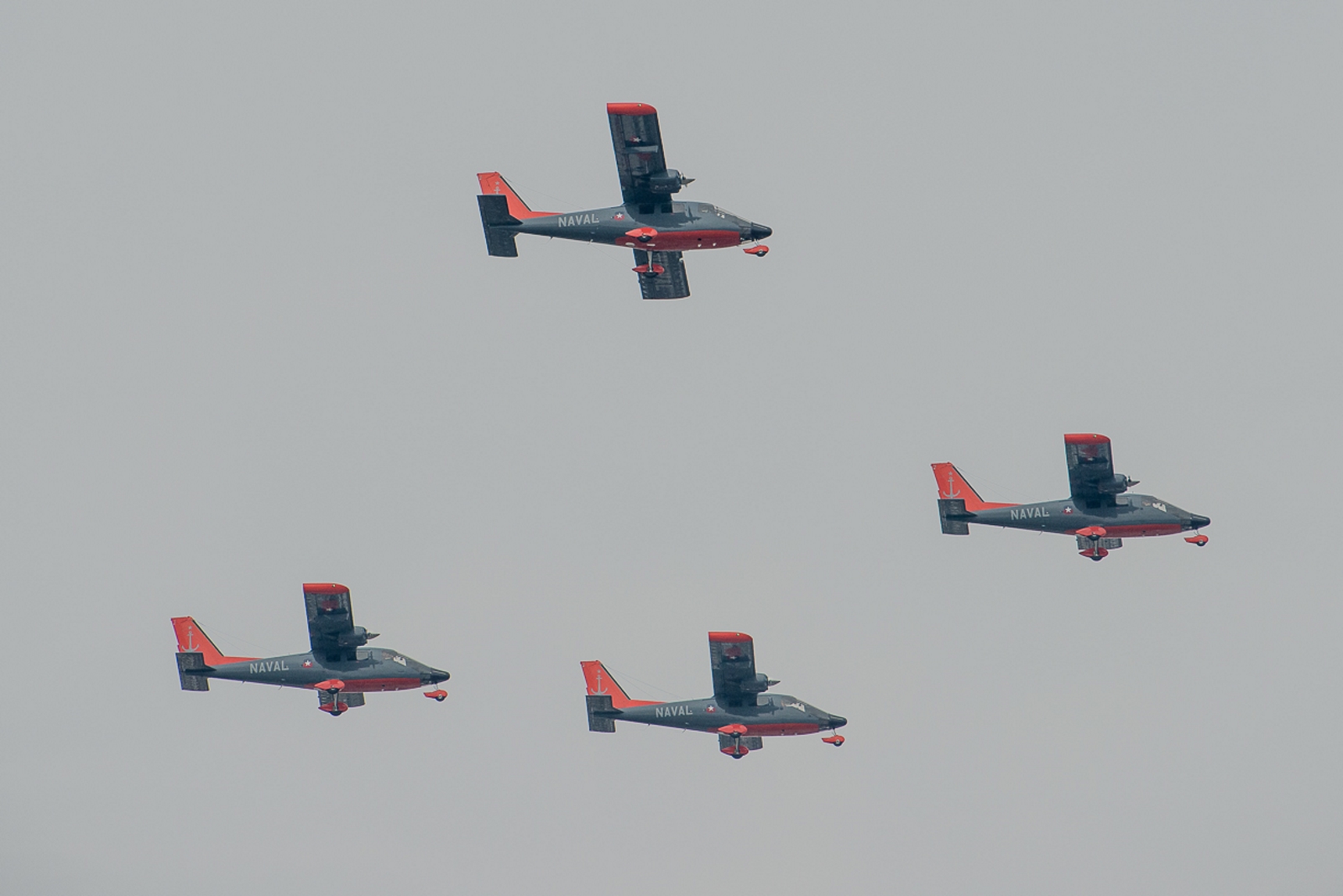 Celebrando el bicentenario institucional, el componente aéreo de la Armada estuvo liderado por su comandante, contralmirante Juan Carlos Pons Jara, e hizo debutar en esta parada a varios exponentes de sus dos adquisiciones más recientes, tres C-295 Persuader y cuatro P68 Observer 2, y otras 15 aeronaves de ala fija o rotativa con mayor trayectoria en su dotación, tres veteranos EMB-111AN Bandeirulha, cinco PC-7 Turbo Trainer, cinco Cougar/Super Puma y tres Dauphin.