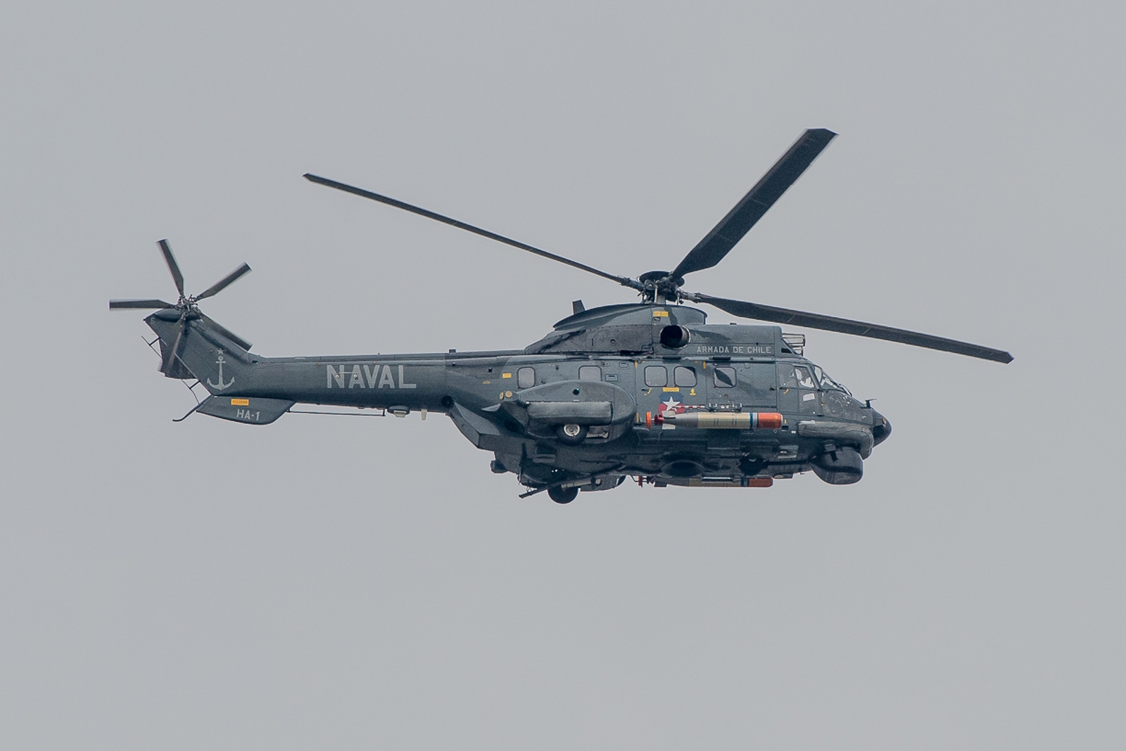 El AS532 Cougar 76 rinde honores a las autoridades y muestra sus torpedos antisubmarinos Mk.46 (foto: Cristian Castro Marín).
