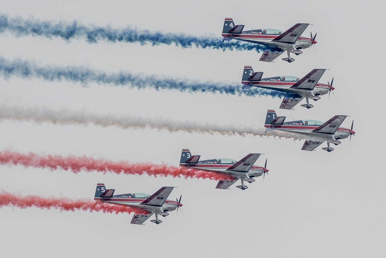 Completando su escalón aéreo también presentó otros conocidos de ediciones anteriores de esta celebración: Acompañando el paso de los cadetes de la Escuela de Aviación “Capitán Ávalos”, pasaron los cinco mono-motores acrobáticos Extra 300L de la Escuadrilla Halcones liderados por el capitán Joseph Suez Fadic y 15 entrenadores T-35 Pillán, liderados por el comandante Carlos Tabilo Silva.