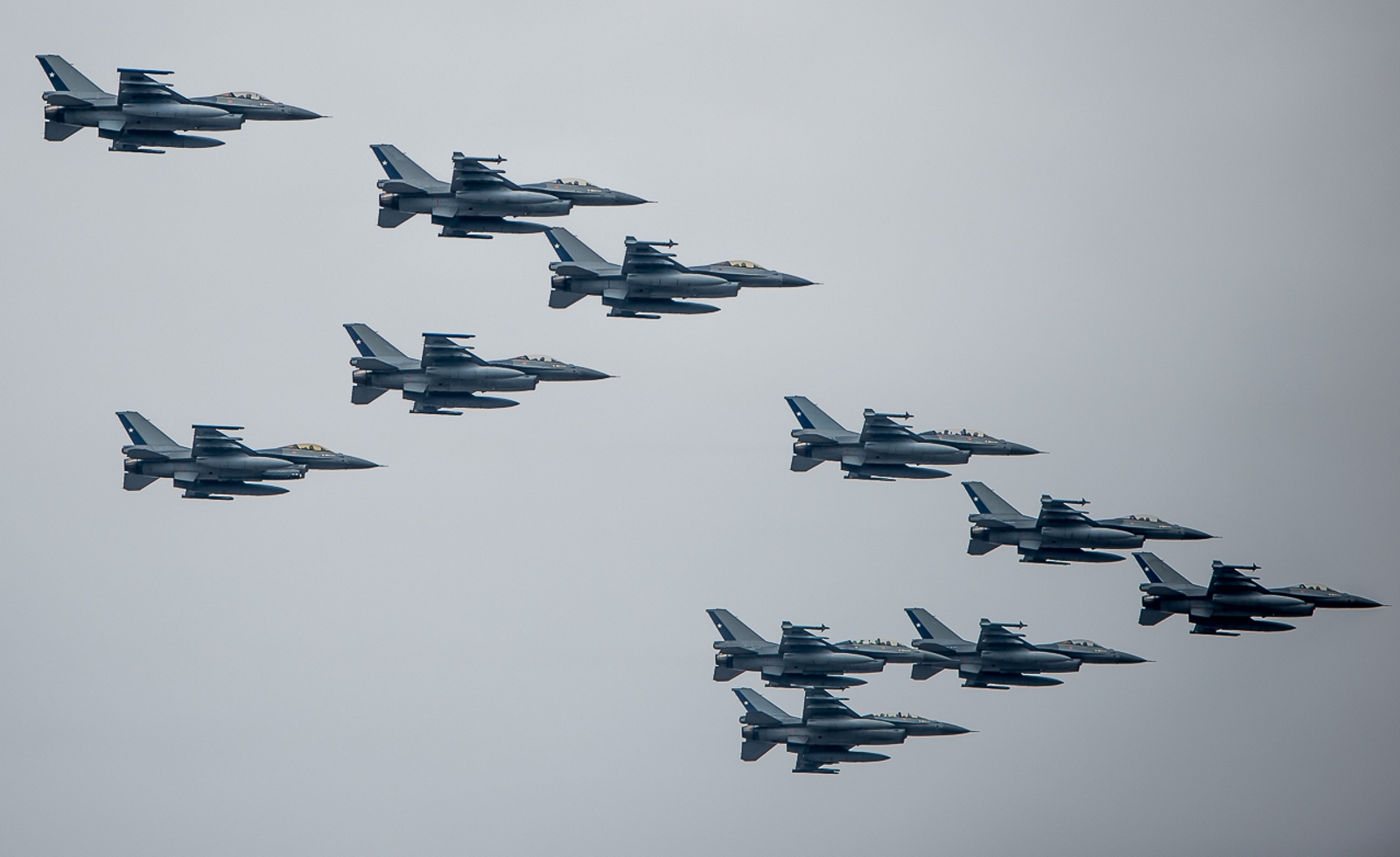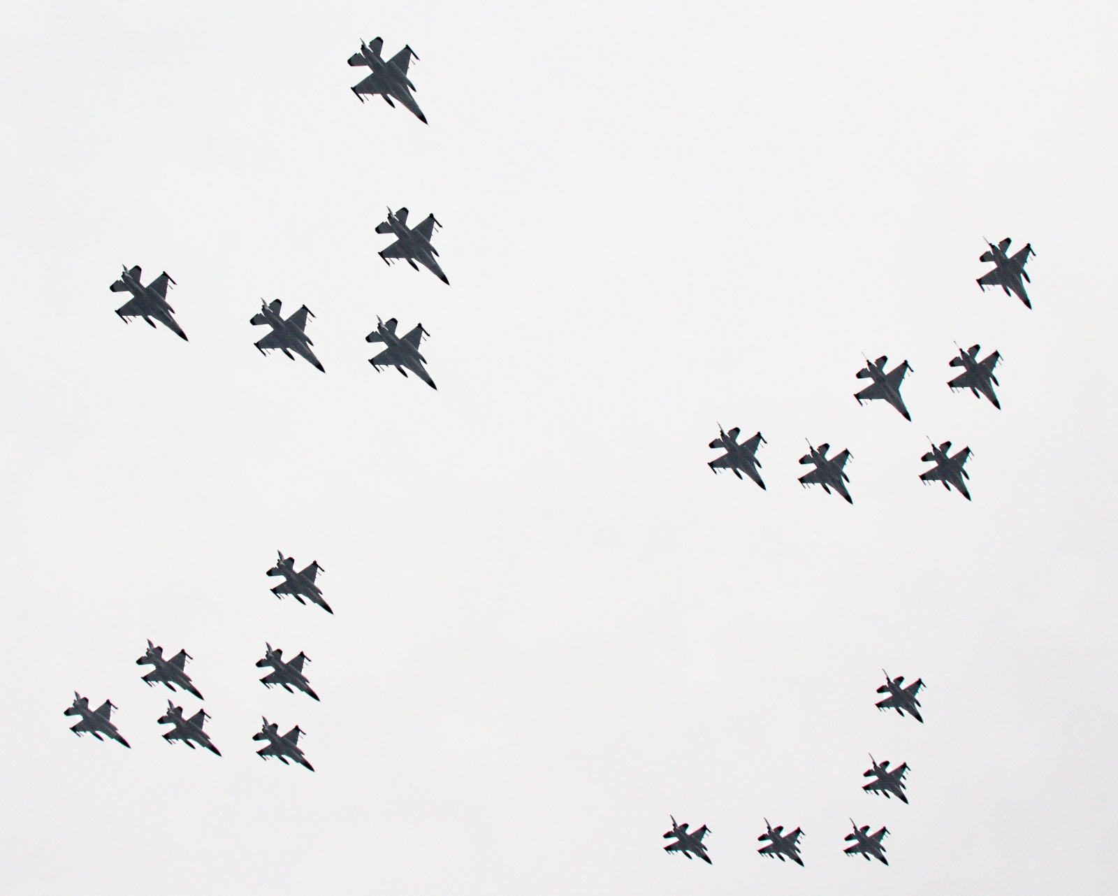 En su aparición más numerosa desde 2015, los F-16 Fighting Falcon se presentaron sobre el cielo capitalino en una formación novedosa integrada por dos escuadrillas de cinco aviones y otras dos de seis ejemplares (foto: Carlos Ay).