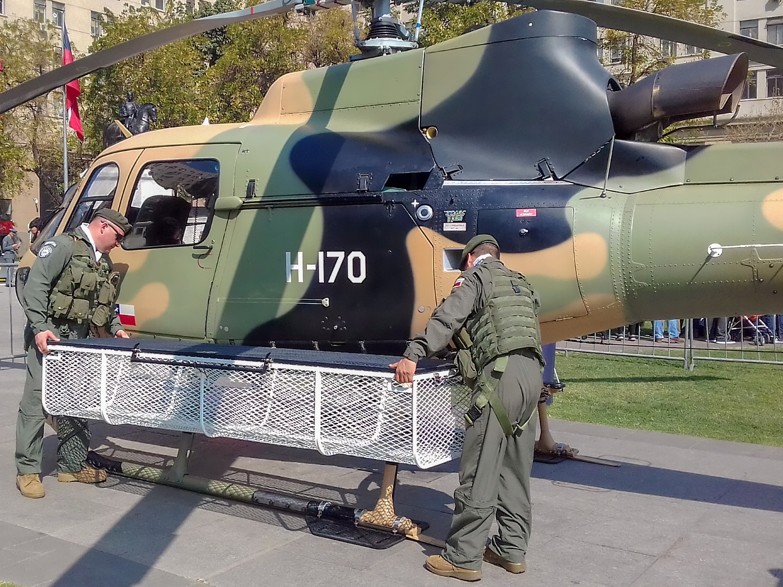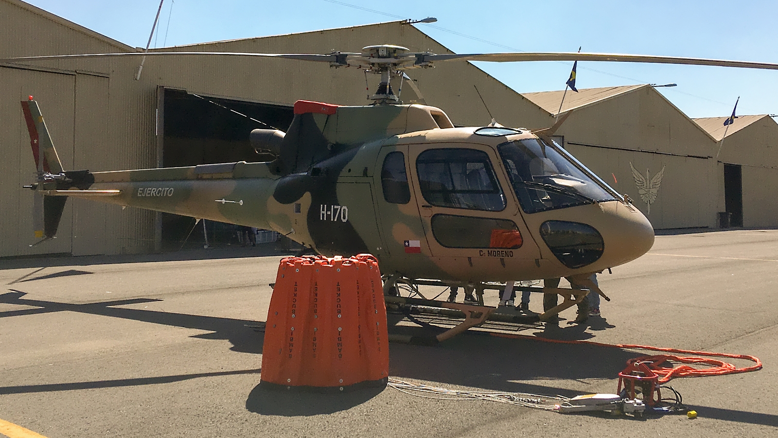 En su breve paso por el palacio de La Moneda, el AS350 Ecureuil H-170 «Co. Moreno» se exhibió con este canasto para cargas externas para operaciones de lucha contra incendios forestales (foto: José Rodríguez Valencia).