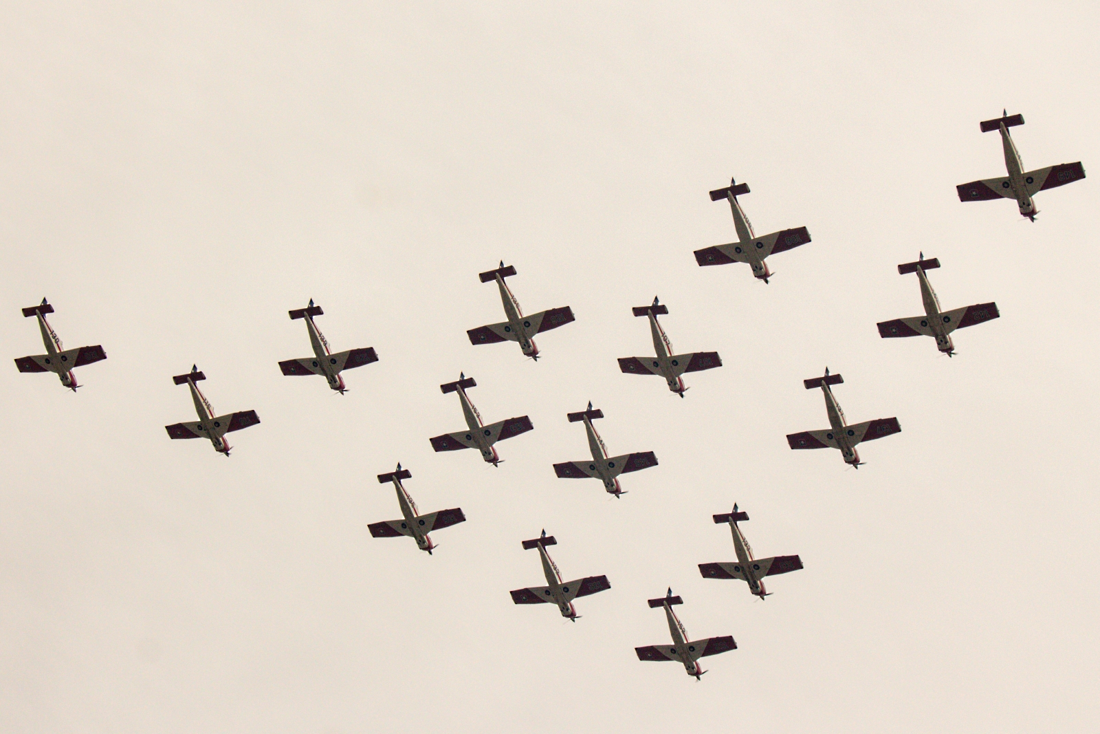 La tradicional formación de 15 ENAER T-35 sobrevuela el Parque de los Reyes camino a la parada militar (foto: Carlos Ay).