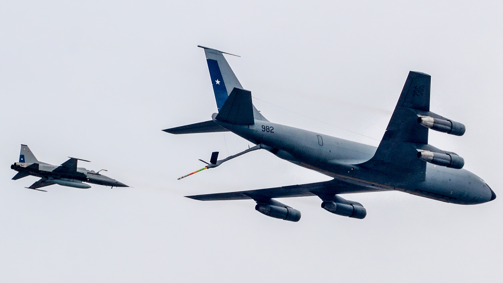 El KC-130R Hercules 990 y dos F-5E Tigre III realizaron un pasaje simulando una operación de re-abastecimiento en vuelo con sistema de sonda y cesta (foto: Cristian Castro Marín).