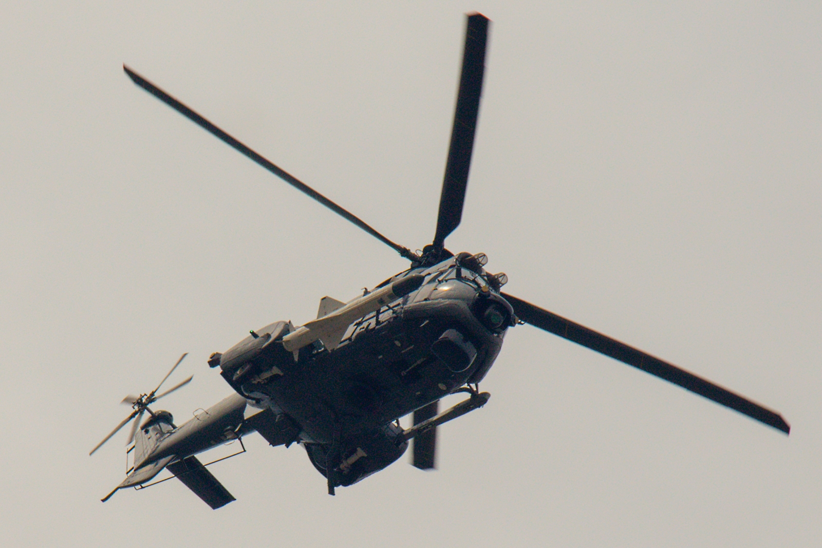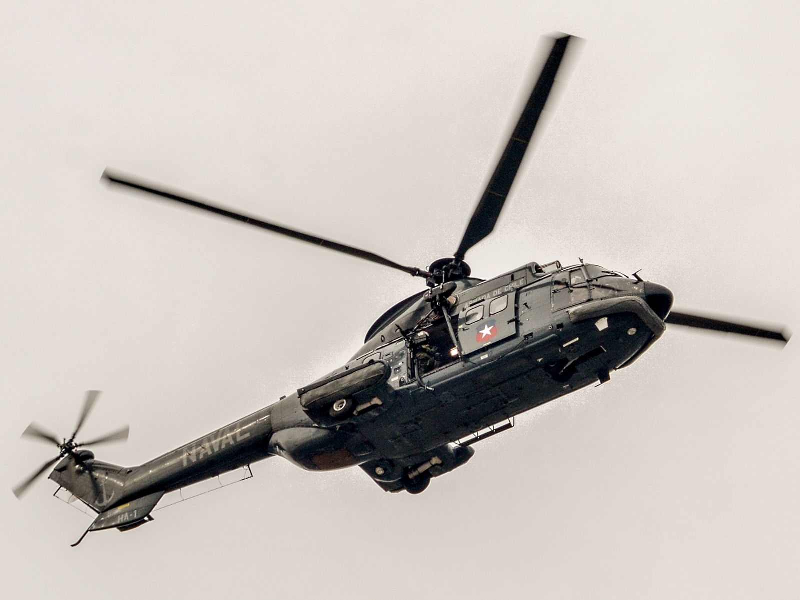 Armado con una ametralladora de puerta, el AS332 Super Puma «NAVAL 80» sobrevuela la elipse del Parque O’Higgins (foto: Cristian Castro Marín).