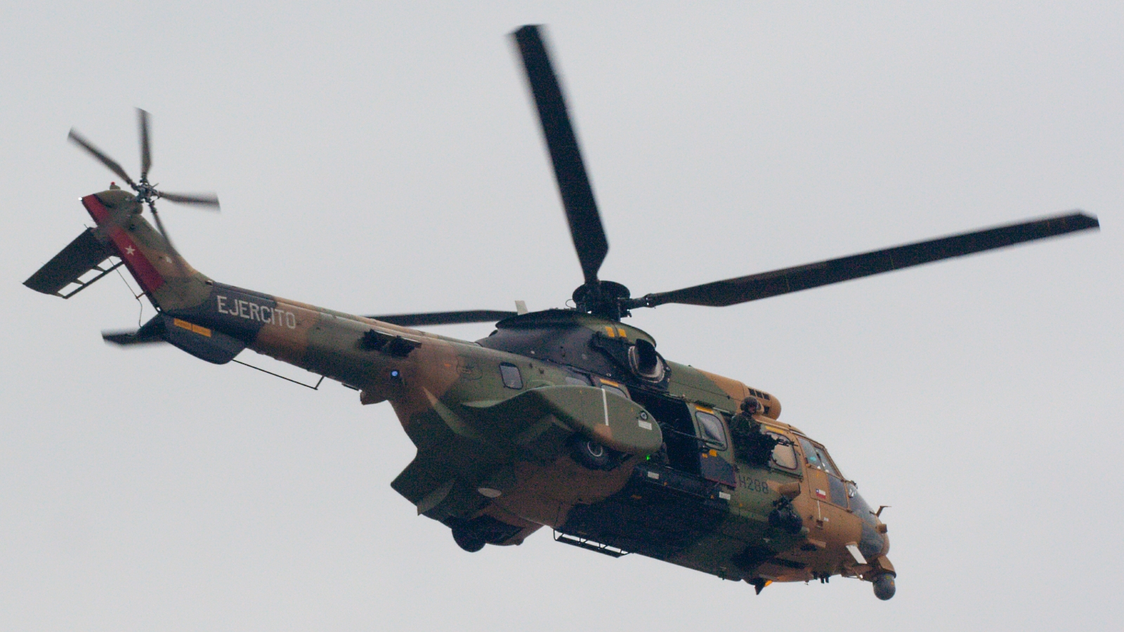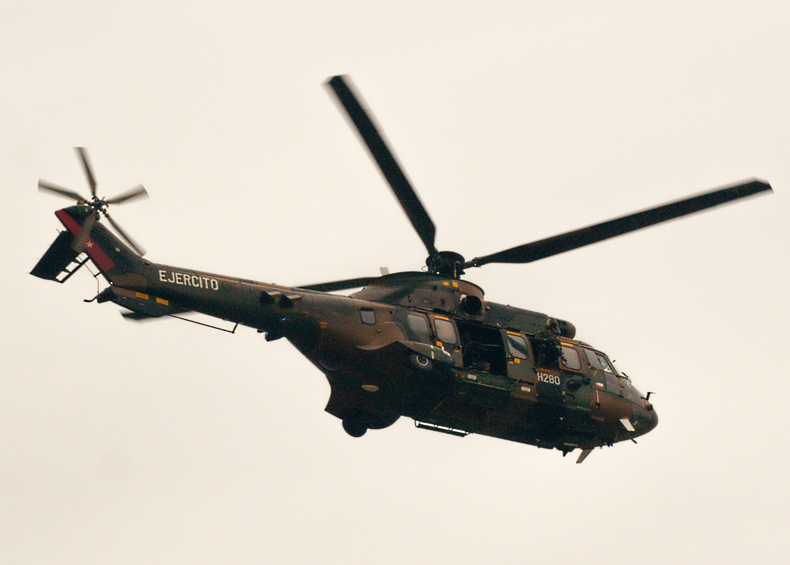 Mimetizado en el esquema correspondiente al teatro de operaciones del Sur de Chile y artillado con dos ametralladoras laterales, el AS532 Cougar H280 «Co. Huentelauquén» sobrevuela el Parque O’Higgins (foto: Carlos Ay).