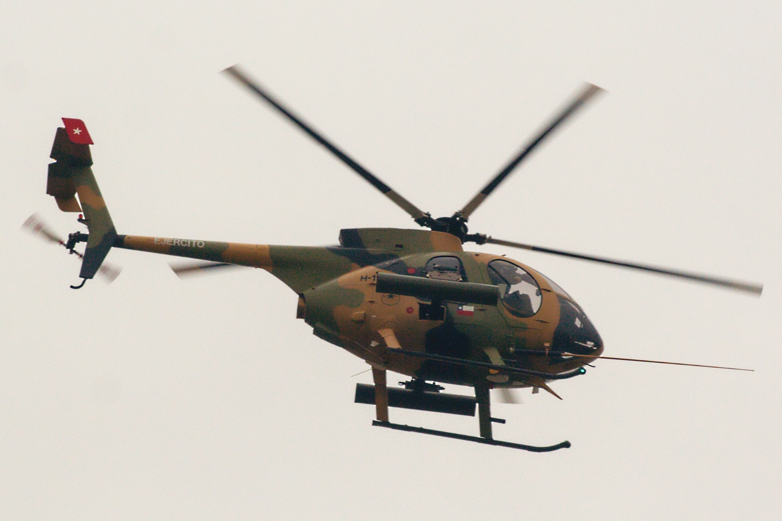Artillado con dos coheteras laterales LAU-60, un MD530 Defender se aproxima al centro de la capital para participar de la parada militar del miércoles 19 (foto: Carlos Ay).