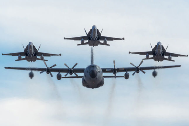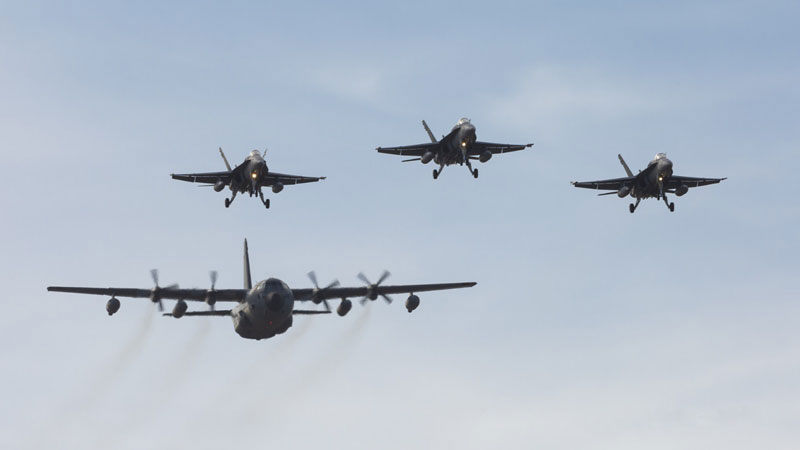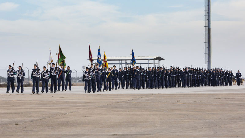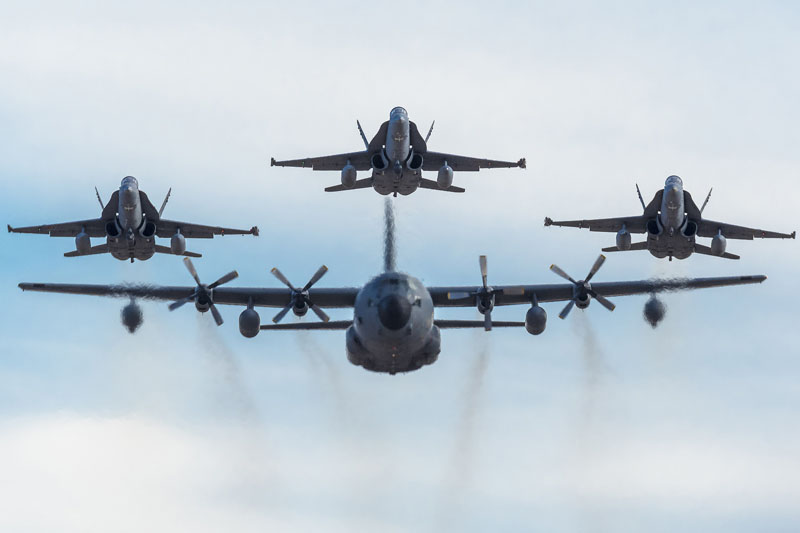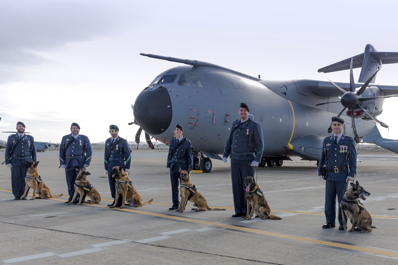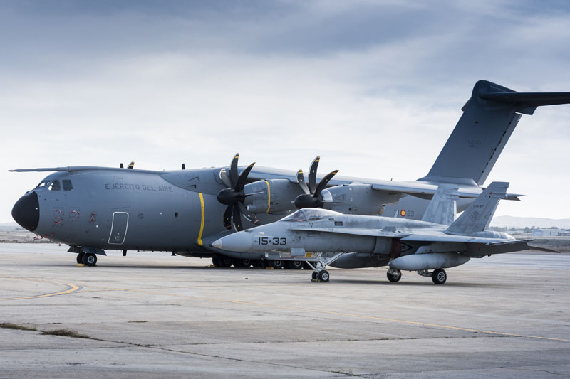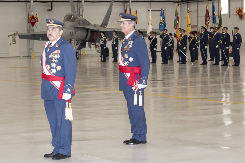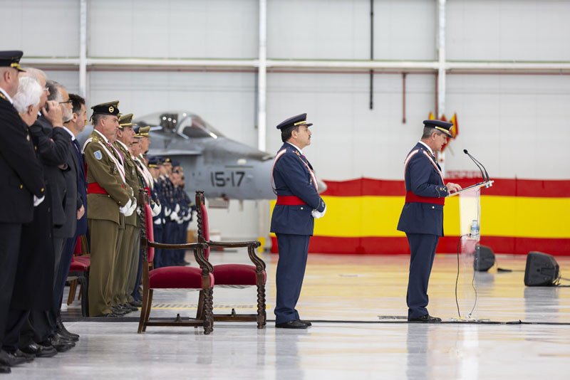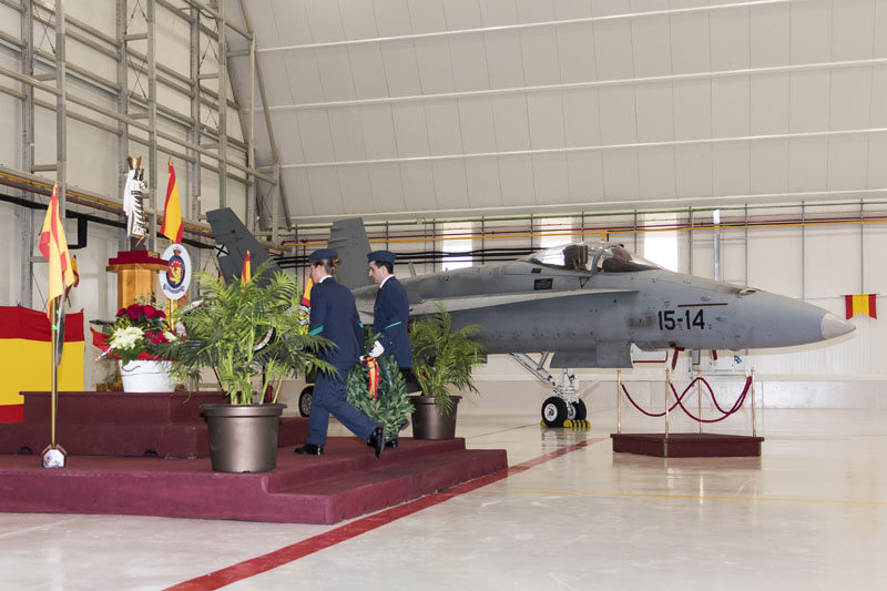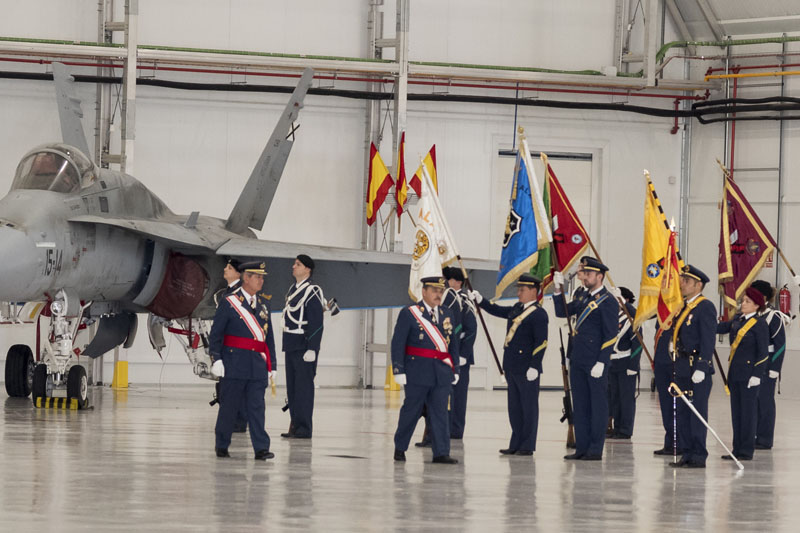 Posteriormente se retiraron los estandartes de las unidades y se pudo presenciar un desfile terrestre en el que participó la escuadrilla de honores, a la que se unió la sección de guías y perros de la Policía Aérea de la Base. A continuación un breve, pero siempre bienvenido, desfile aéreo de tres EF-18M y un C-130H cerró la ceremonia. Los actos finalizaron con la invitación al “vino español” en el que se realizó el acostumbrado brindis por Su Alteza Real el Rey Don Felipe VI, con lo que se dio fin a esta jornada entrañable de celebración, homenaje y confraternización.