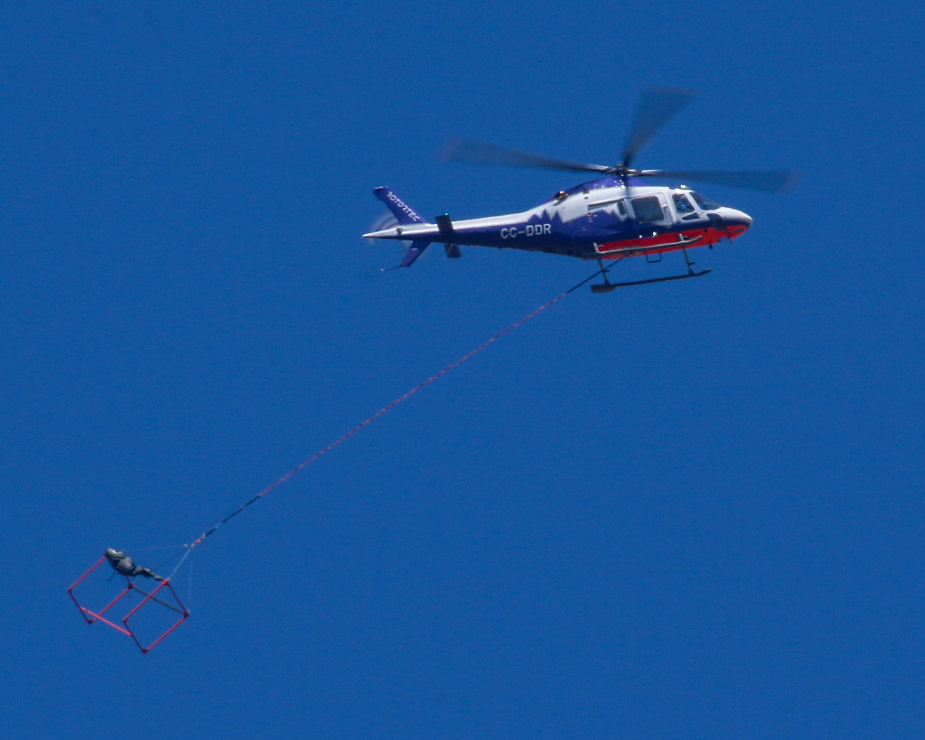 La máquina se hizo presente en el punto de embarque a media mañana y ejecutó tres ascensiones hasta la cumbre del cerro para trasladar bicicletas (colgando en una eslinga ventral) y pasajeros que llegarían rápidamente hasta la cumbre para inicial una experiencia de «2:30 [horas] de descenso puro, intensidad y dificultad altas» acompañados por un «guía experto en la ruta, en montaña, ciclismo y primeros auxilios», según indica el sitio web de la empresa… a costo que podemos estimar entre US $ 345 y US $535 por persona.