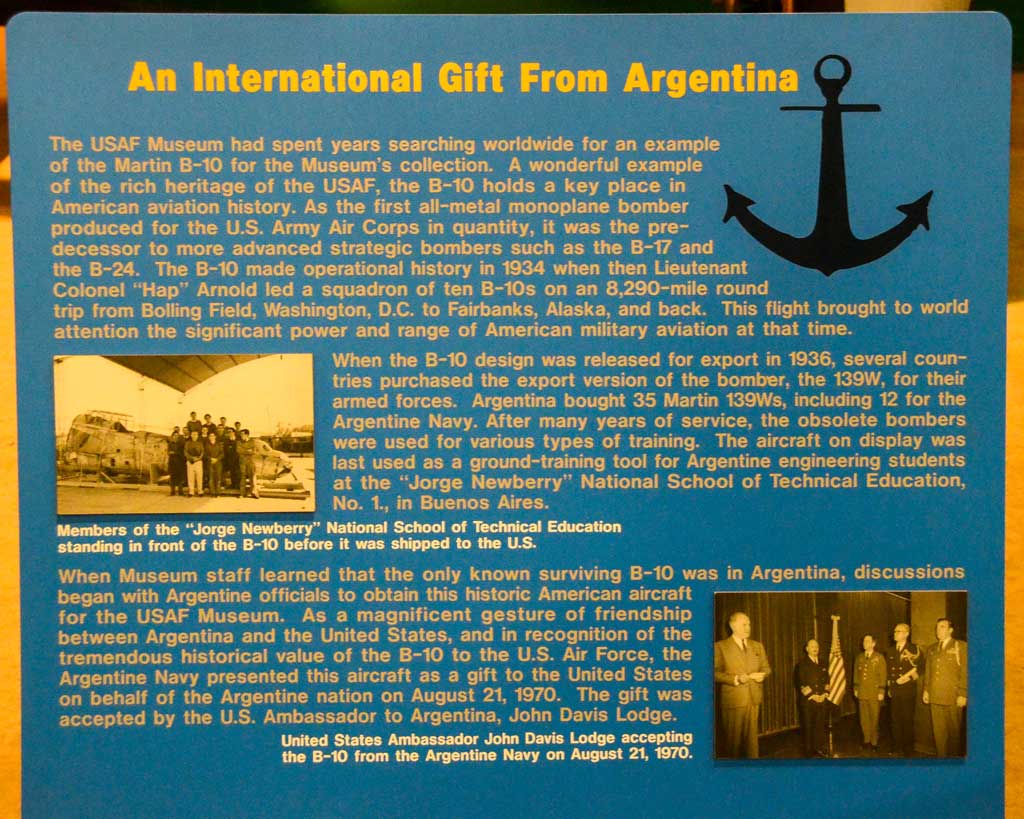 Finalizaba diciendo que, como un magnífico gesto de amistad entre la Argentina y los Estados Unidos y en reconocimiento al tremendo valor histórico que el B-10 representaba para la Fuerza Aérea de aquéllos, la Armada Argentina había donado el avión el 21 de agosto de 1970, siendo aceptada la entrega por el entonces embajador americano, John David Lodge.