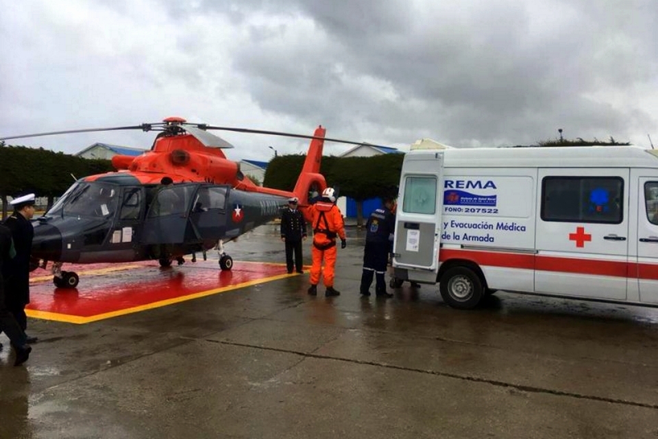 Embarcado en un AS365 Dauphin desde esa remota instalación, ubicada en pleno Océano Pacífico 426 km. al Sur de Punta Arenas, el herido fue trasladado con todo éxito hasta el helipuerto de la Base Naval de Punta Arenas, donde fue transferido por la vía terrestre al Hospital de las Fuerzas Armadas “Cirujano Cornelio Guzmán”.