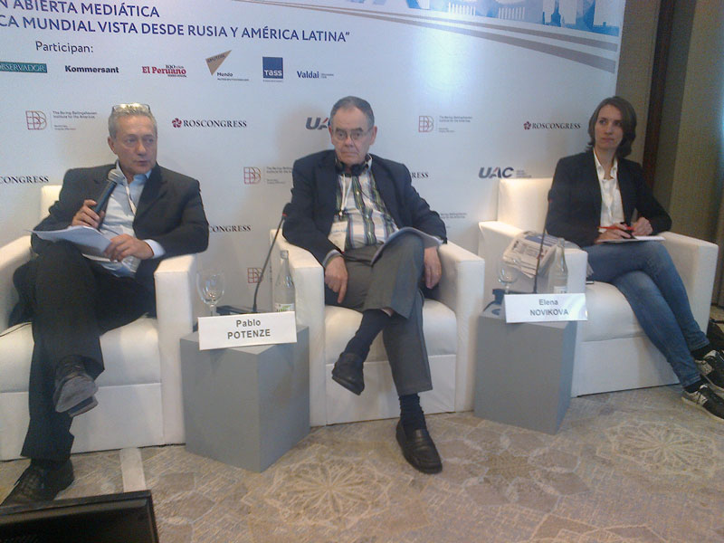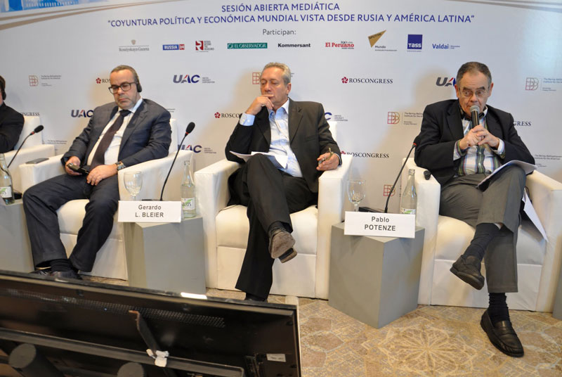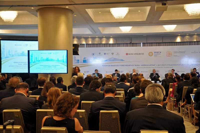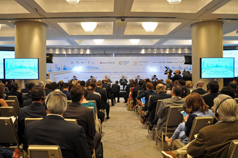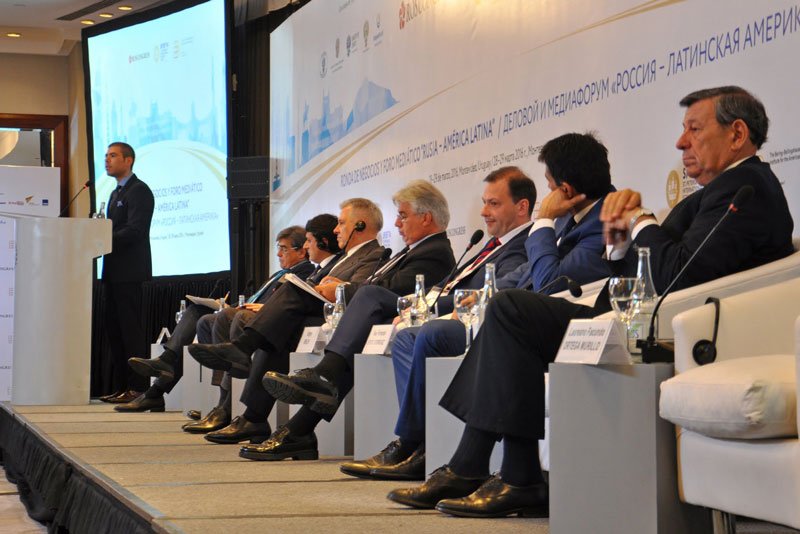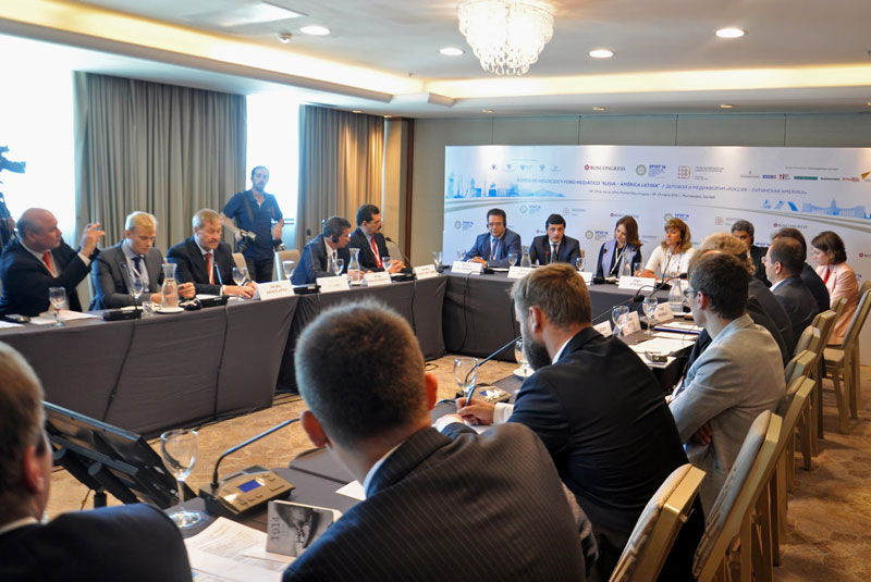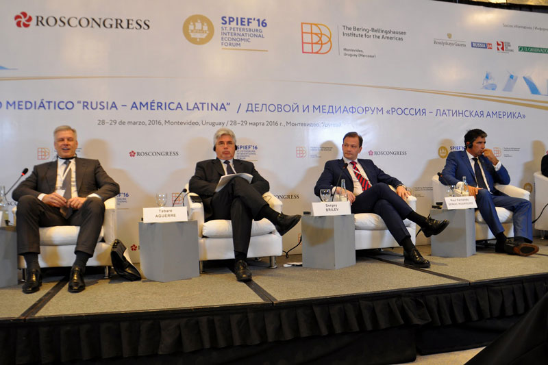 Seguidamente el Embajador Labetskiy y el Vicedirector del Canal de Televisión Pública Rossiya y Presidente del IBBA, Sergey Brilev, pronunciaron palabras de bienvenida dando paso a la reunión plenaria “Rusia-América Latina: lo que podemos lograr juntos”. El panel de la misma estuvo compuesto por Raúl Fernando Sendic Rodríguez, Vicepresidente de la República Oriental del Uruguay, Tabaré Aguerre, Ministro de Ganadería, Agricultura y Pesca de la República Oriental del Uruguay, Sergey Dankvert, Jefe del Servicio Federal de Supervisión Veterinaria y Fitosanitaria de Rusia, y presidente de las partes rusas de las comisiones intergubernamentales con Uruguay, Argentina, Chile y Ecuador, Antón Iniutsin, Viceministro de Energía de la Federación Rusa, Vasili Titov, primer sustituto del presidente del Consejo de Administración del Banco VTB y Laureano Facundo Ortega Murillo, delegado especial del Presidente de Nicaragua para la cooperación con Rusia. En este caso la moderación estuvo a cargo de Sergey Brilev y Miguel Bas Fernández, de la Agencia Sputnik.