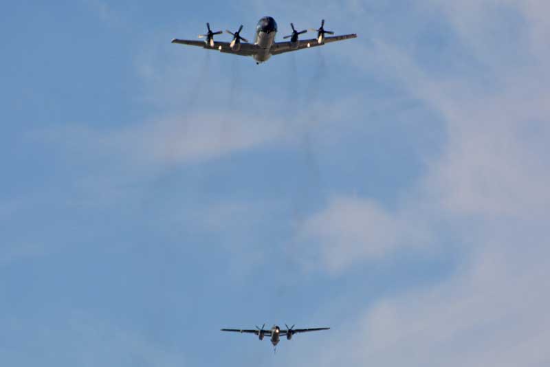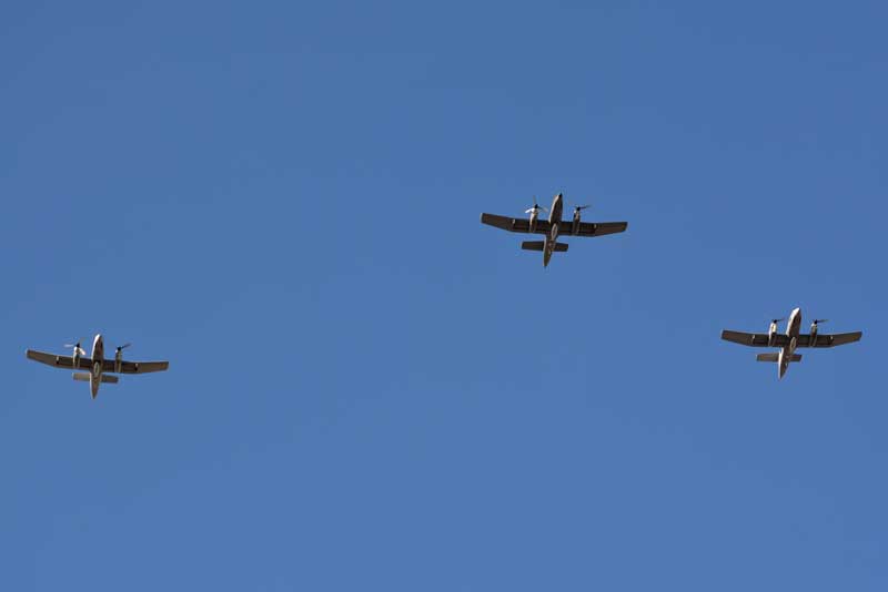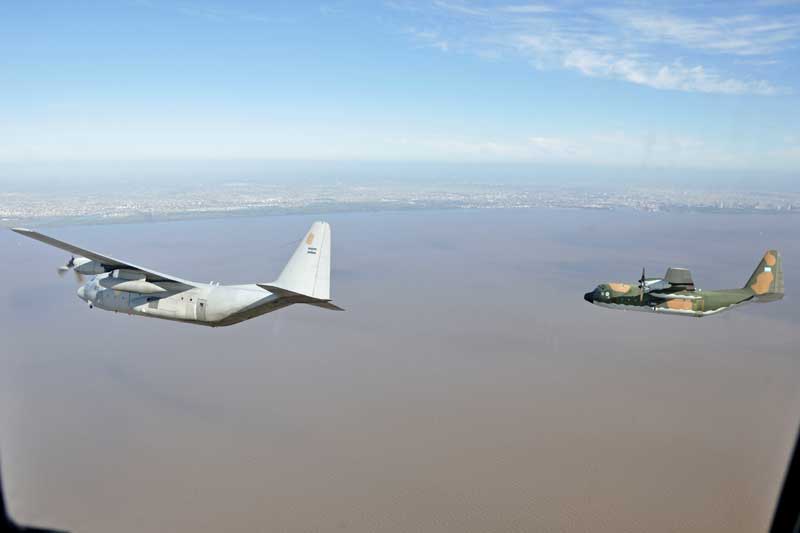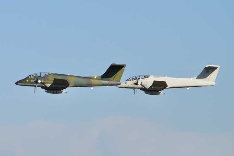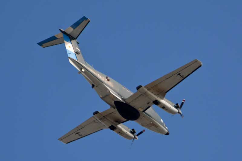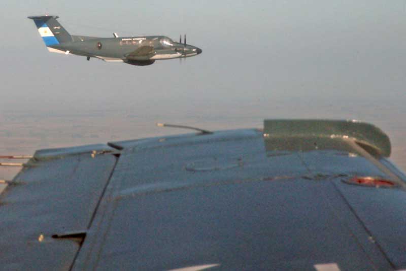 Mientras que la ARA hizo lo propio con el Orion como líder, a sus laterales formaron un Beechcraft B-200F Super King Air y un Beechcraft B-200 “Cormorán”, mientras que el S-2T Turbo Tracker cerró la formación por detrás de ellos.